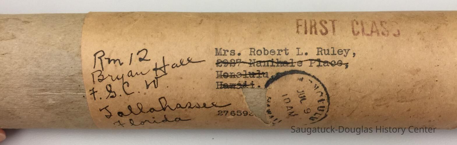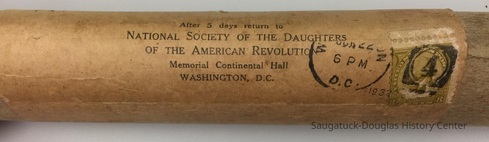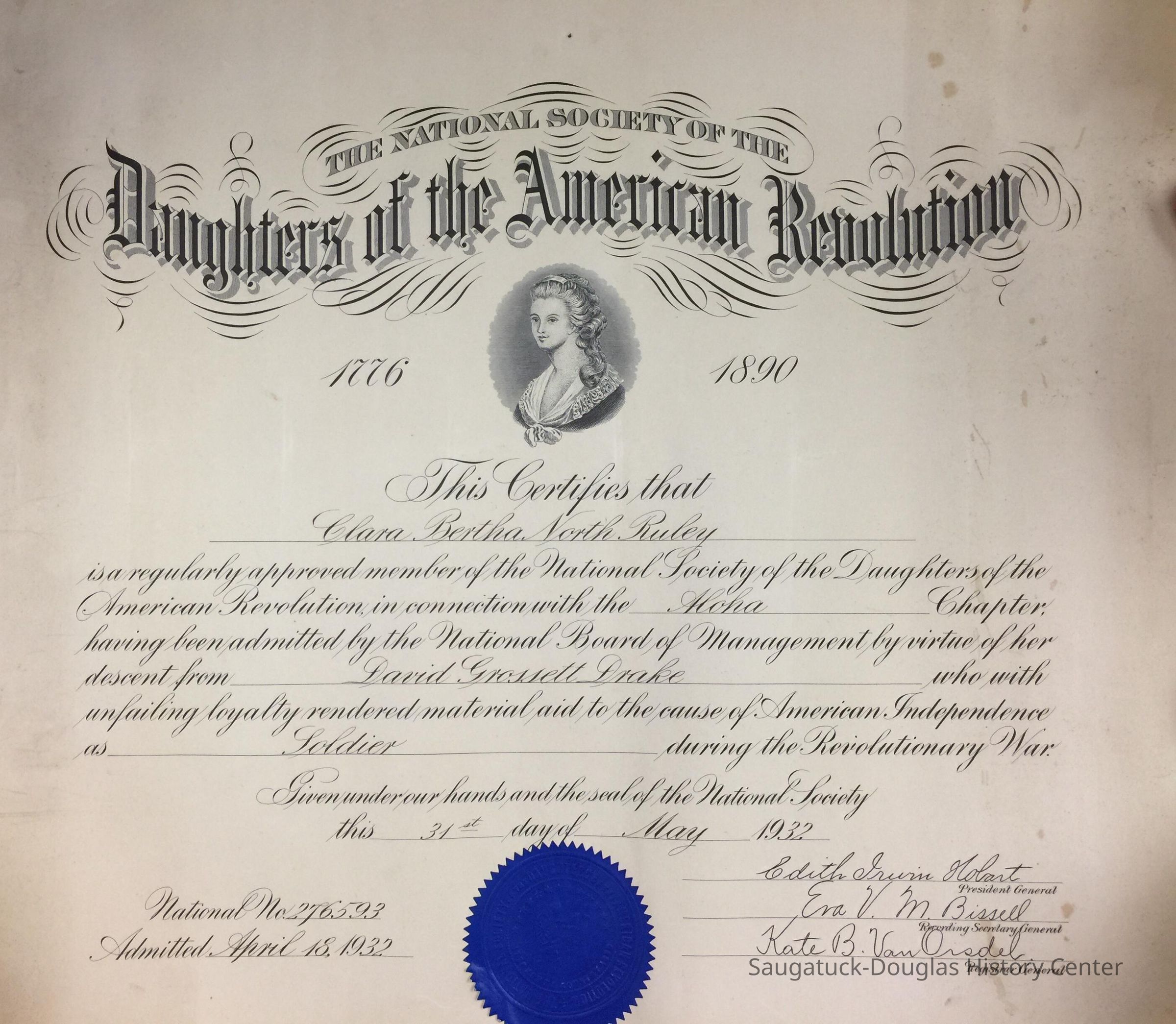 Daughters of the American Revolution certificate for Clara Bertha North Ruley, Aloha Chapter, for descent from the soldier David Grossett Drake. Ther certificate is dated May 31, 1932 and was mailed in a kraft paper tube to Mrs. Robert L. Ruley in Hawaii on Jul 9.