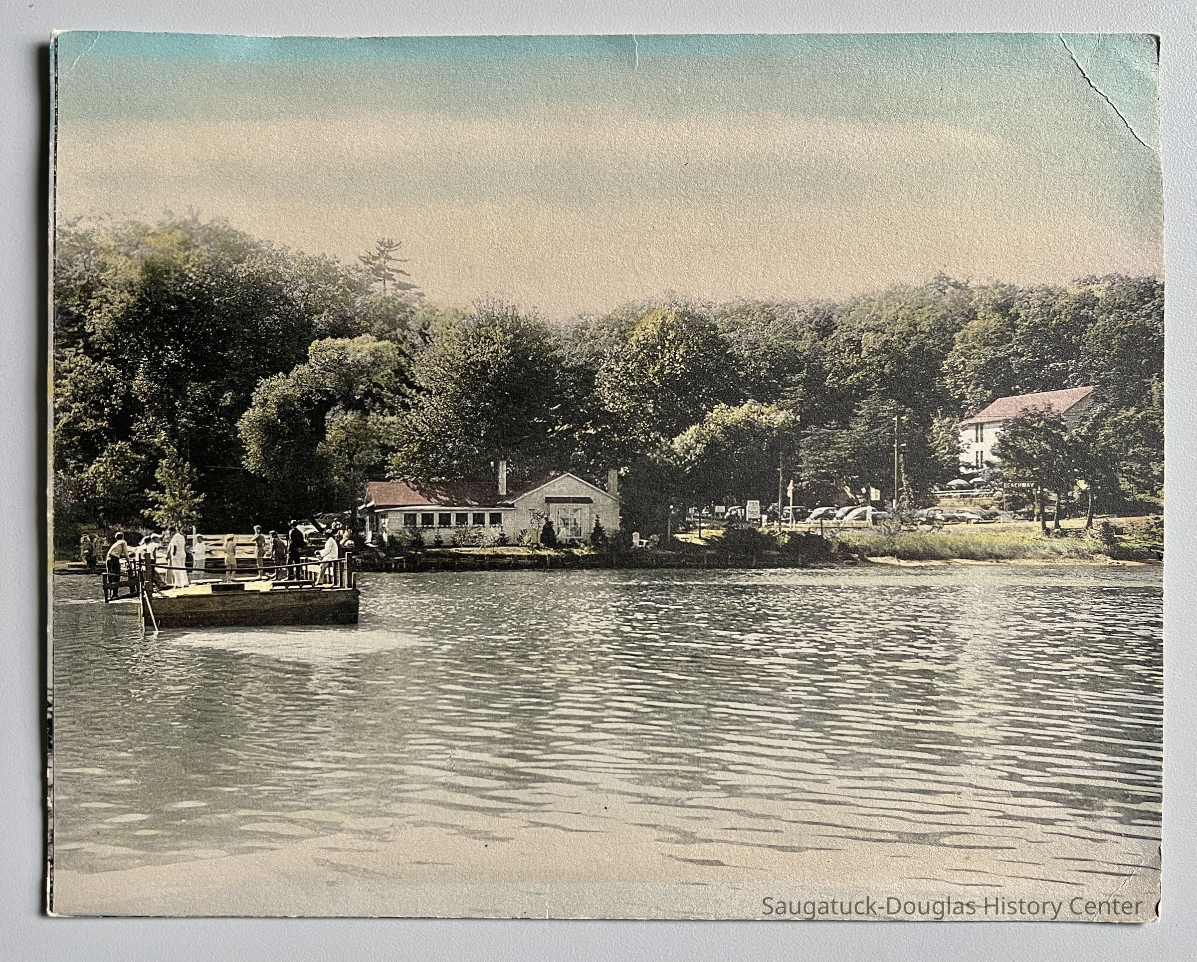 Colorized photo of the Chain Ferry scow, the west side ferry landing and the Ferry Store. The Beachway is at the far right.Photograph Details
