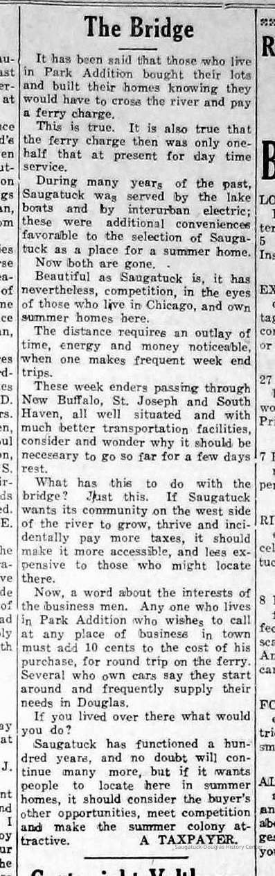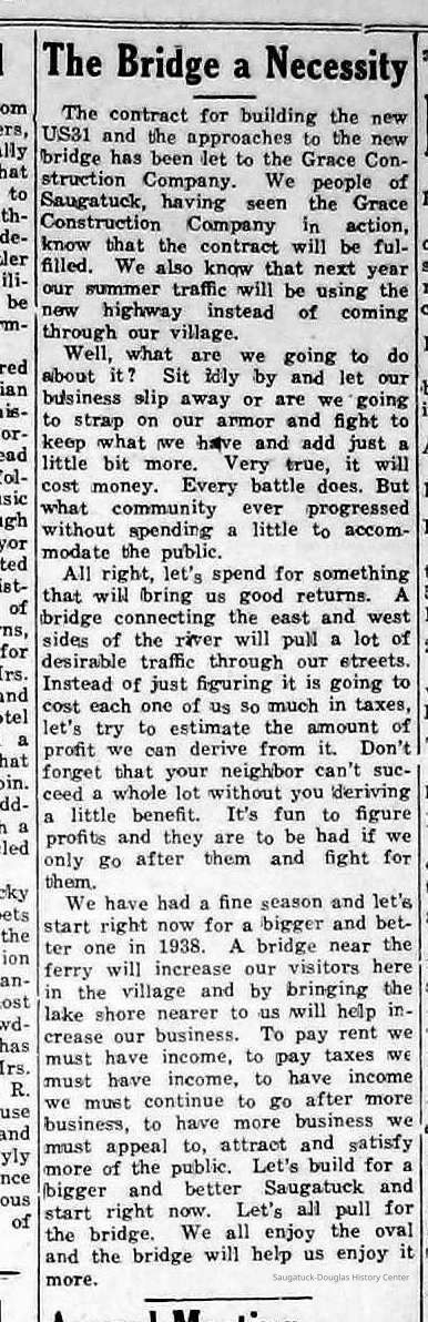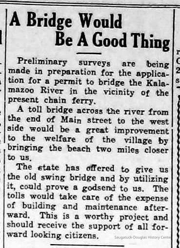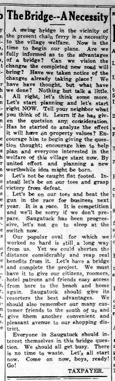 Scans of Commercial Record newspaper clippings about proposals to build a bridge near the Saugatuck Chain Ferry crossing. These projects were never realized.