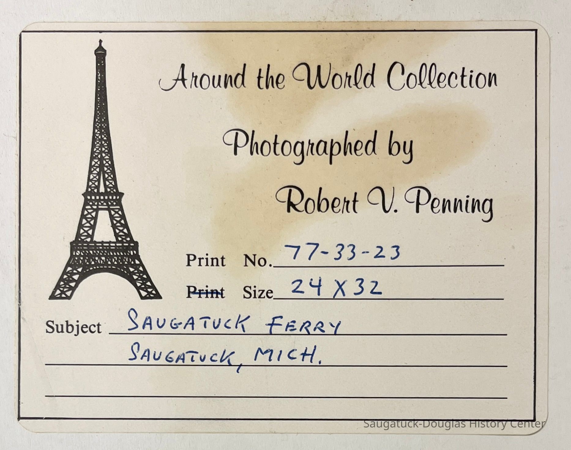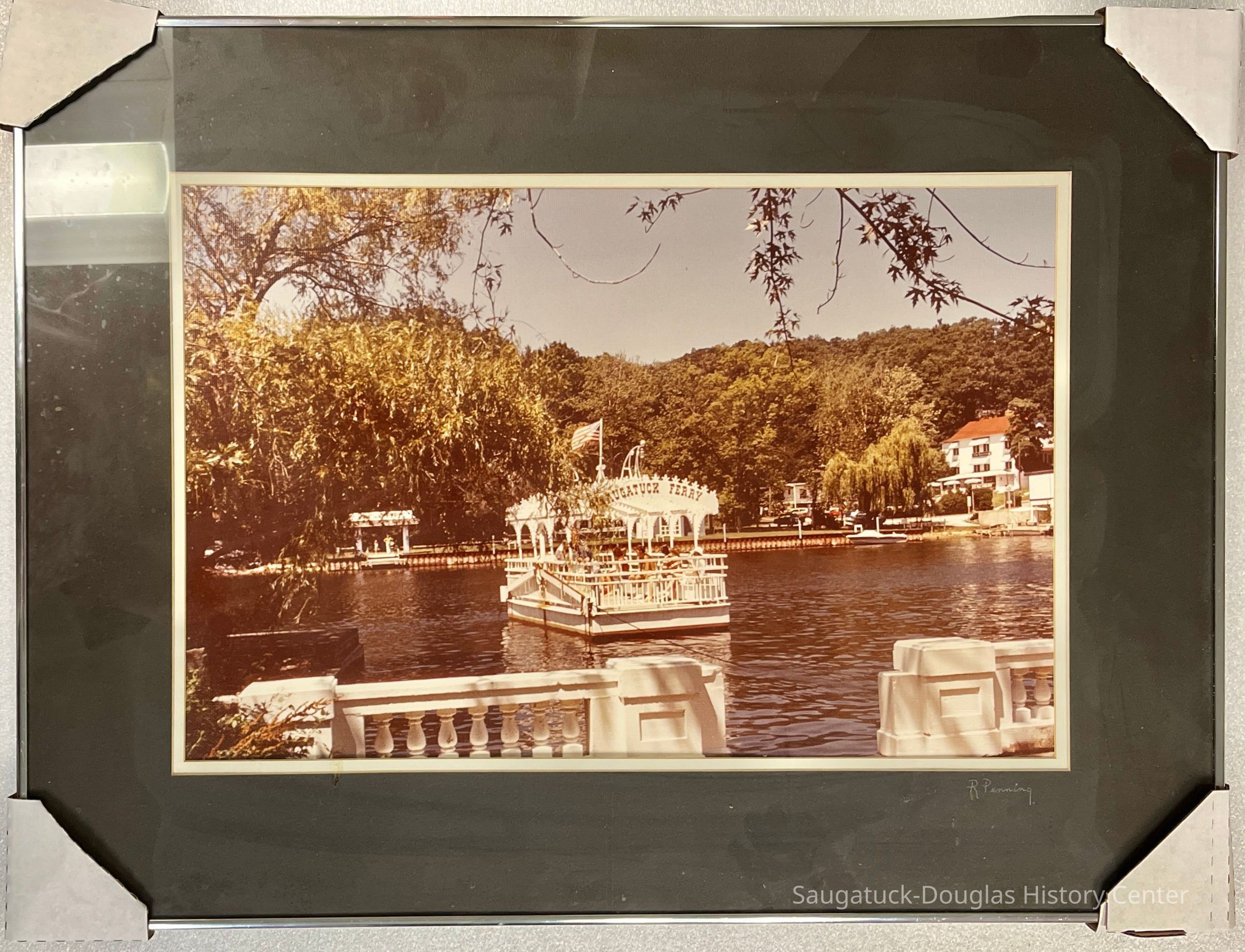 A label on the back of the frame reads "Around the World Collection, photographed by Robert V. Penning, Print No. 77-33-23, Size 24x32, Subject Saugatuck Ferry, Saugatuck, Mich."