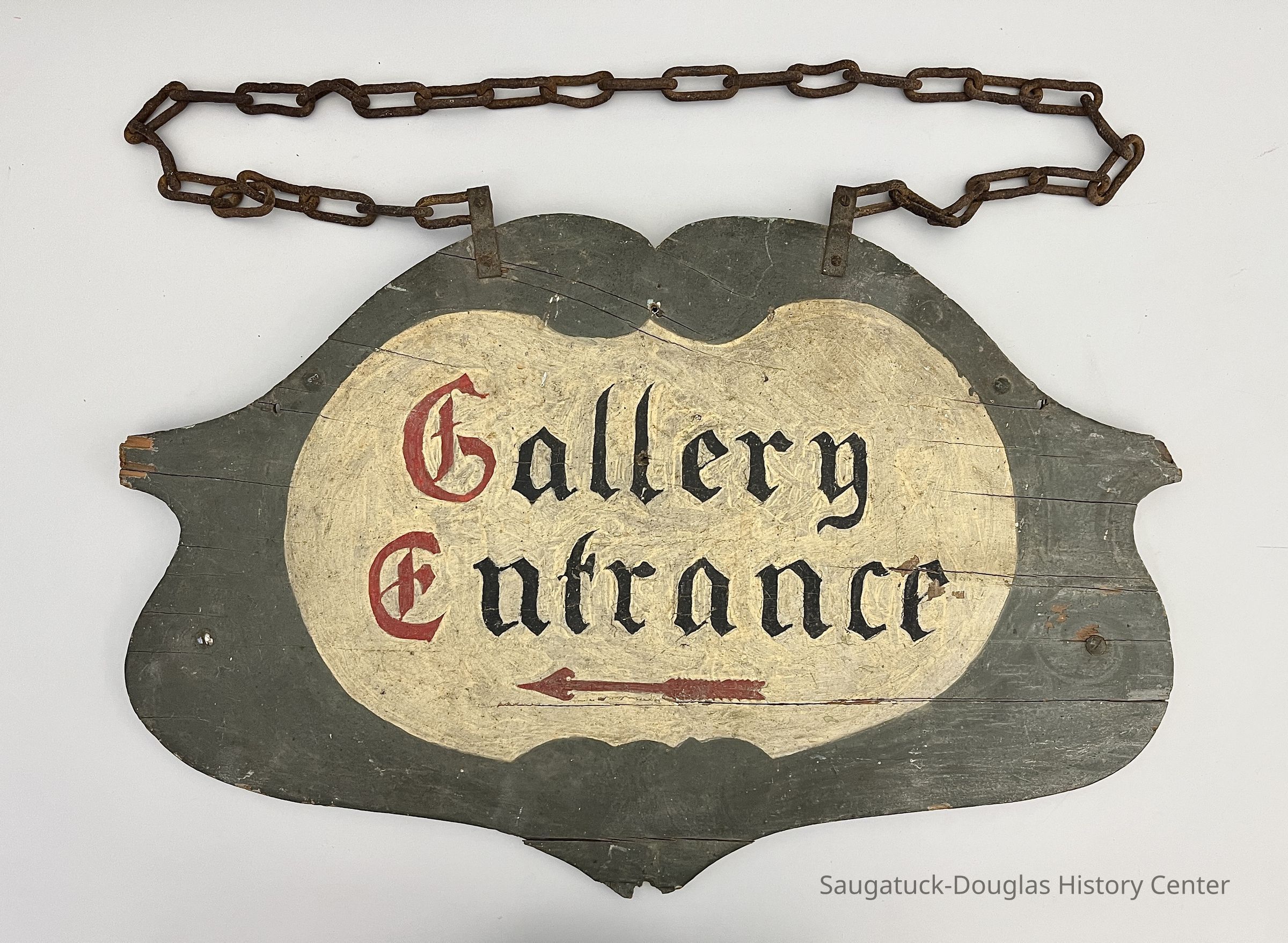 Flat, plywood painted wood sign in a crest shape with an approximately 32-inch metal chain for hanging. The sign's central medallion is painted beige with "Gallery Entrance" in a Gothic/Blackletter script with the G and E painted red.Context