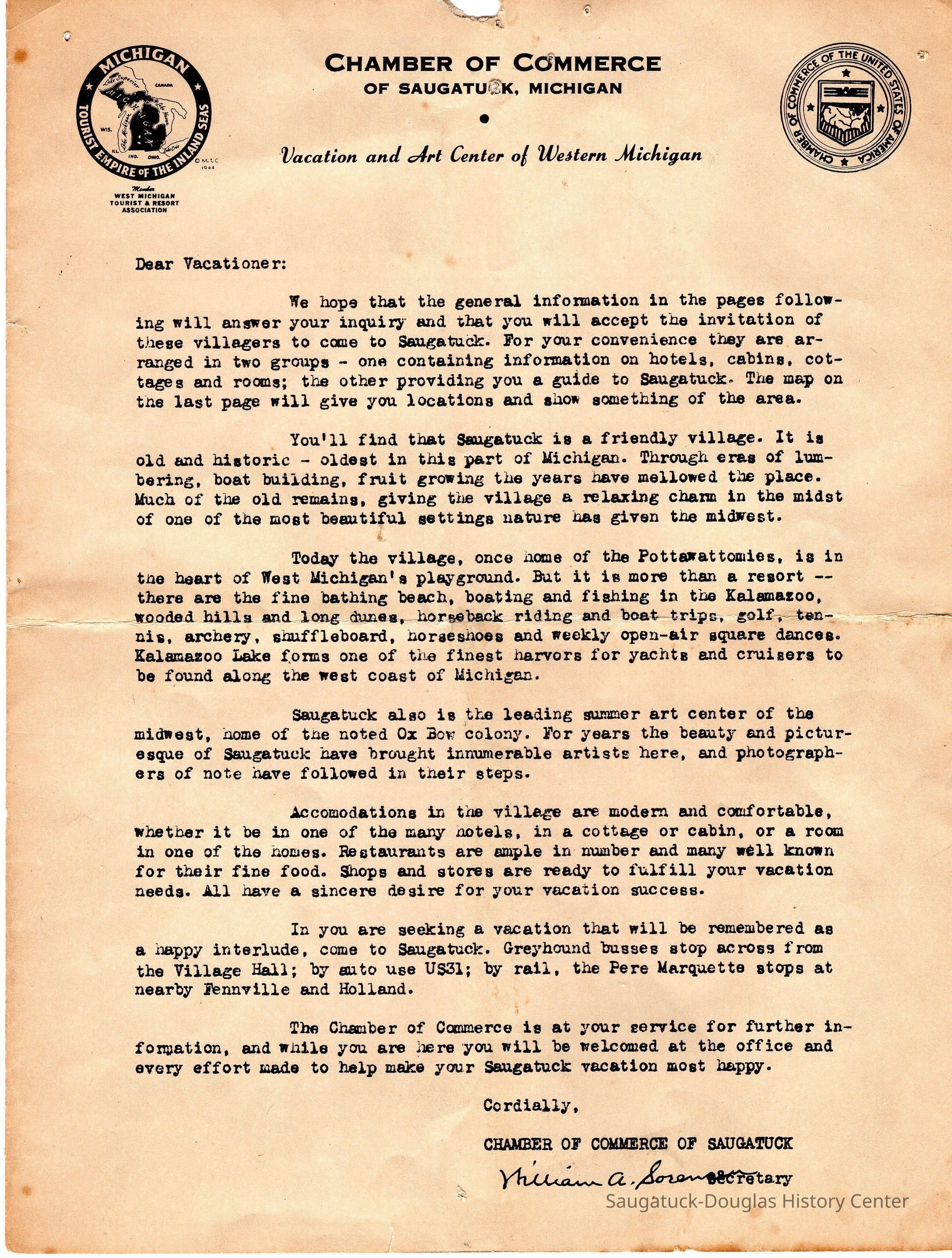 2. Cover letter to vacationers with a quick history and overview of attractions. Signed by William A. Sorensen. Digital file dated 1948.