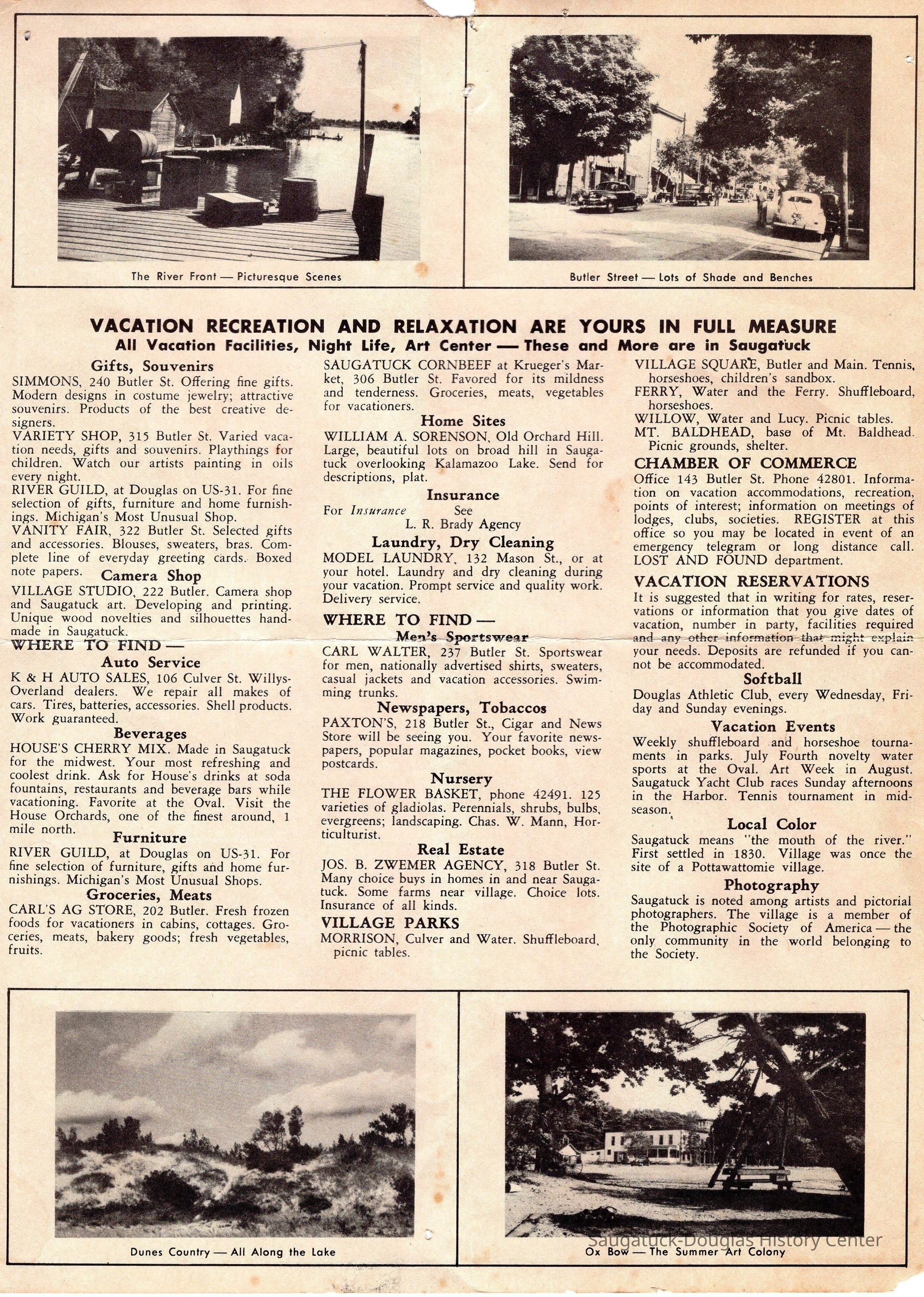4. "Vacation recreation and relaxation are yours in full measure" information page listing Simmons, Variety Shop, River Guild, Vanity Fair, Village Studio Camera Shop, K & H. Auto Sales, House's Cherry Mix, Carl's AG Store, Saugatuck Cornbeef, William A. Sorenson home sites, Model Laundry, Carl Walter menswear, Paxton's newspapers, Flower Basket nursery, Jos. B. Zwemer Real Estate. Page also lists parks, advice about reservations, softball, shuffleboard, horseshoe, July 4 novelty water sports at Oval, Art Week in August, Saugatuck Yacht Club races on Sunday afternoons, tennis tournaments, meaning of name Saugatuck, and membership in Photographic Society of America.Context