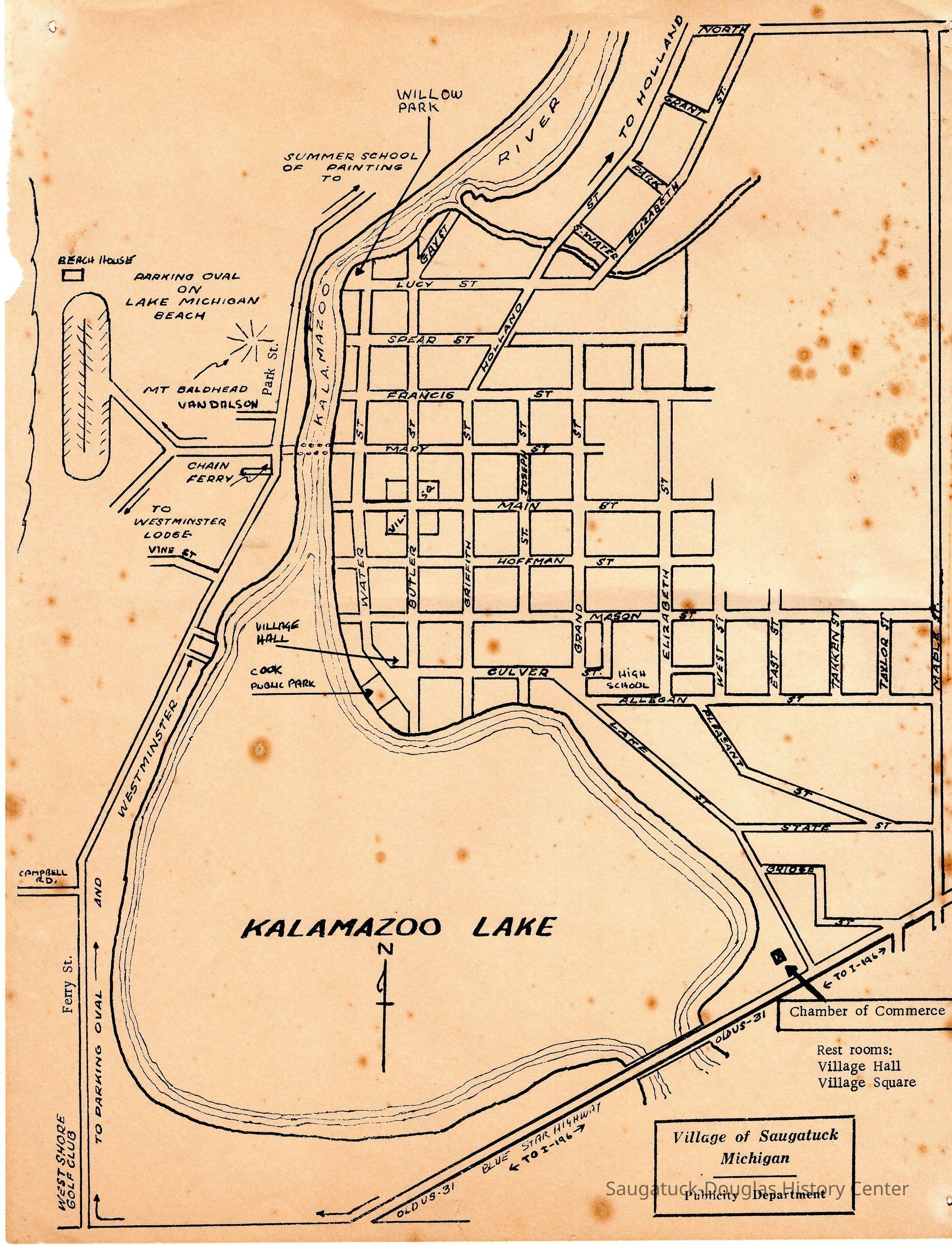 1. Publicity department area map that shows location of Chamber of Commerce office on Lake Street; Bridge Street on the north side of the new Blue Star Highway with "Old U.S.-31" indicated; the location of the high school that burned in 1950; Mary, Main and Spear streets uninterrupted; north Elizabeth Street, Gay St., South Water St. and Park St. that no longer exist; and the Pluim Beach House and a single parking lot at Oval Beach.