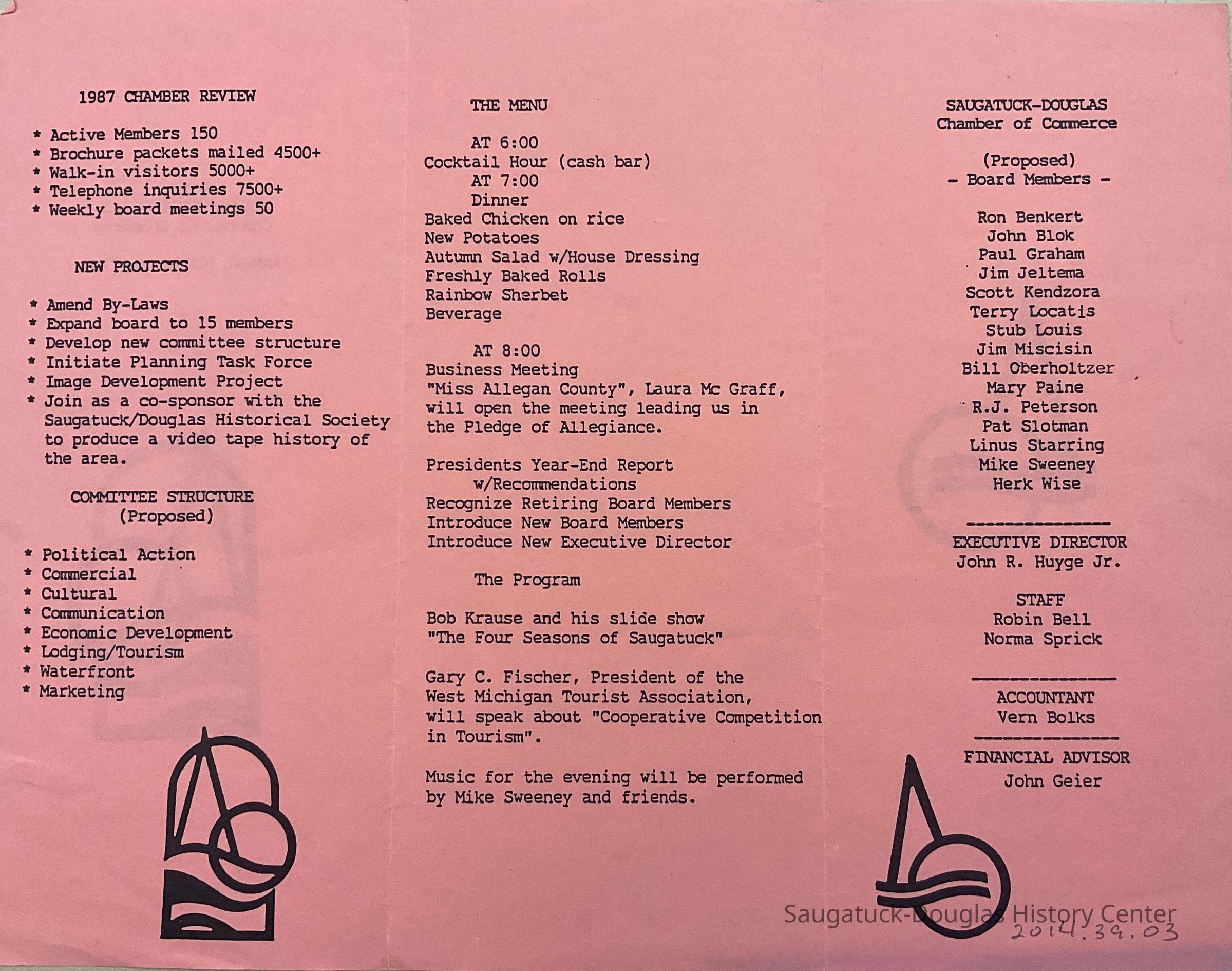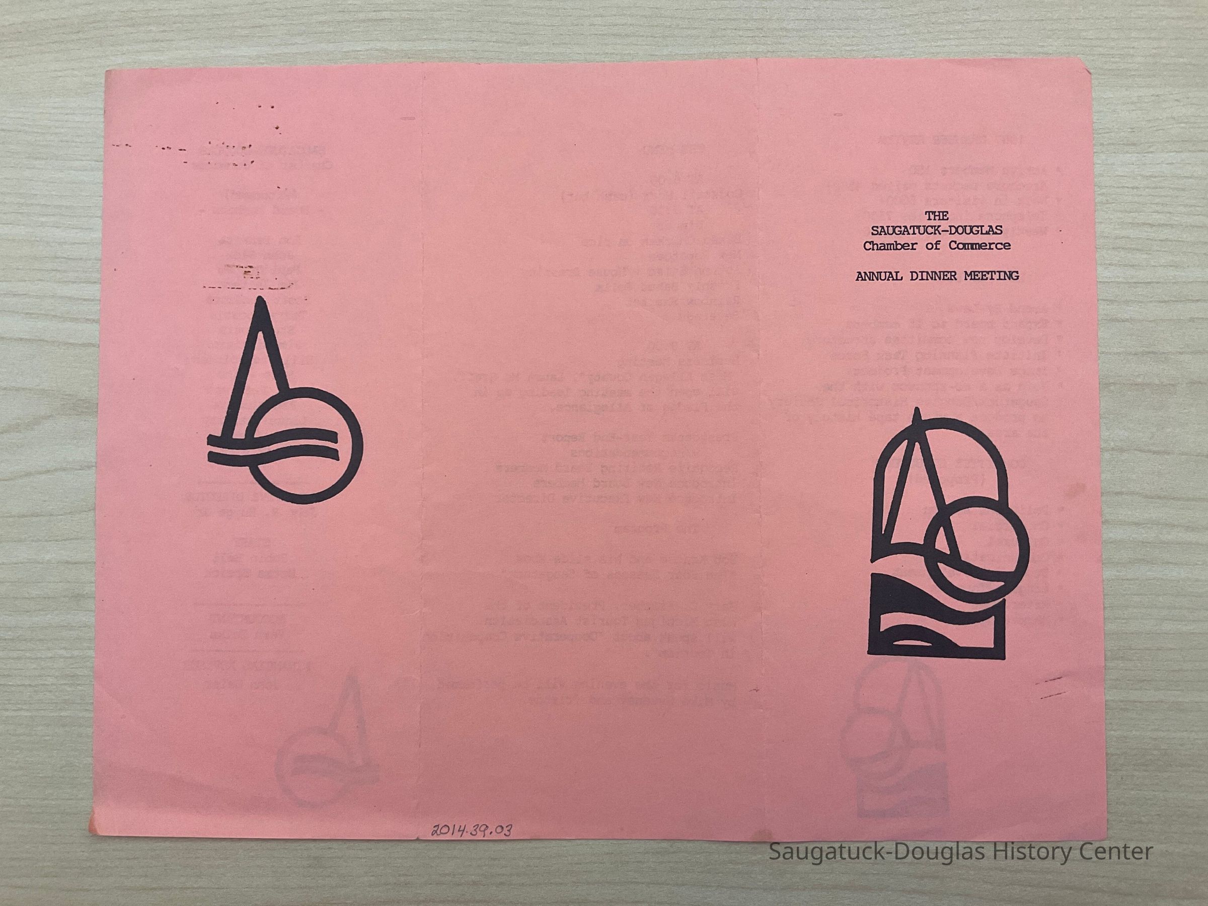 Program from the 1987 SAUGATUCK-DOUGLAS Chamber of Commerce Annual Dinner. Front and back of an 8.5 x 11 inch peach-colored piece of paper.Context