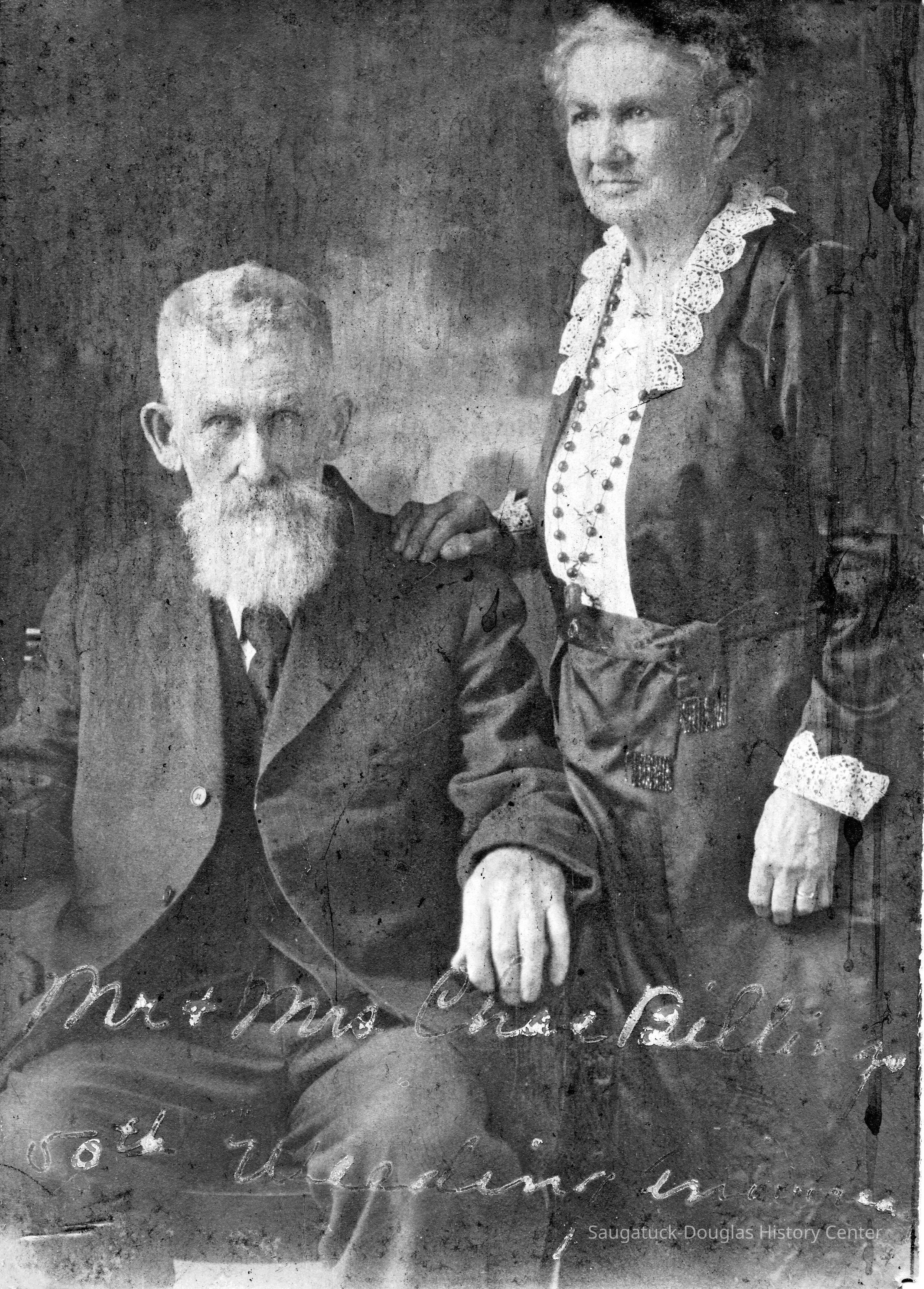 Studio portrait of an elderly man and wife, Charles & Clarana Billings, taken to commemorate their 50th wedding anniversary. The man, seated in an armchair, has a long, pale beard and prominent ears. His spouse is standing by his side, hand on his shoulder.