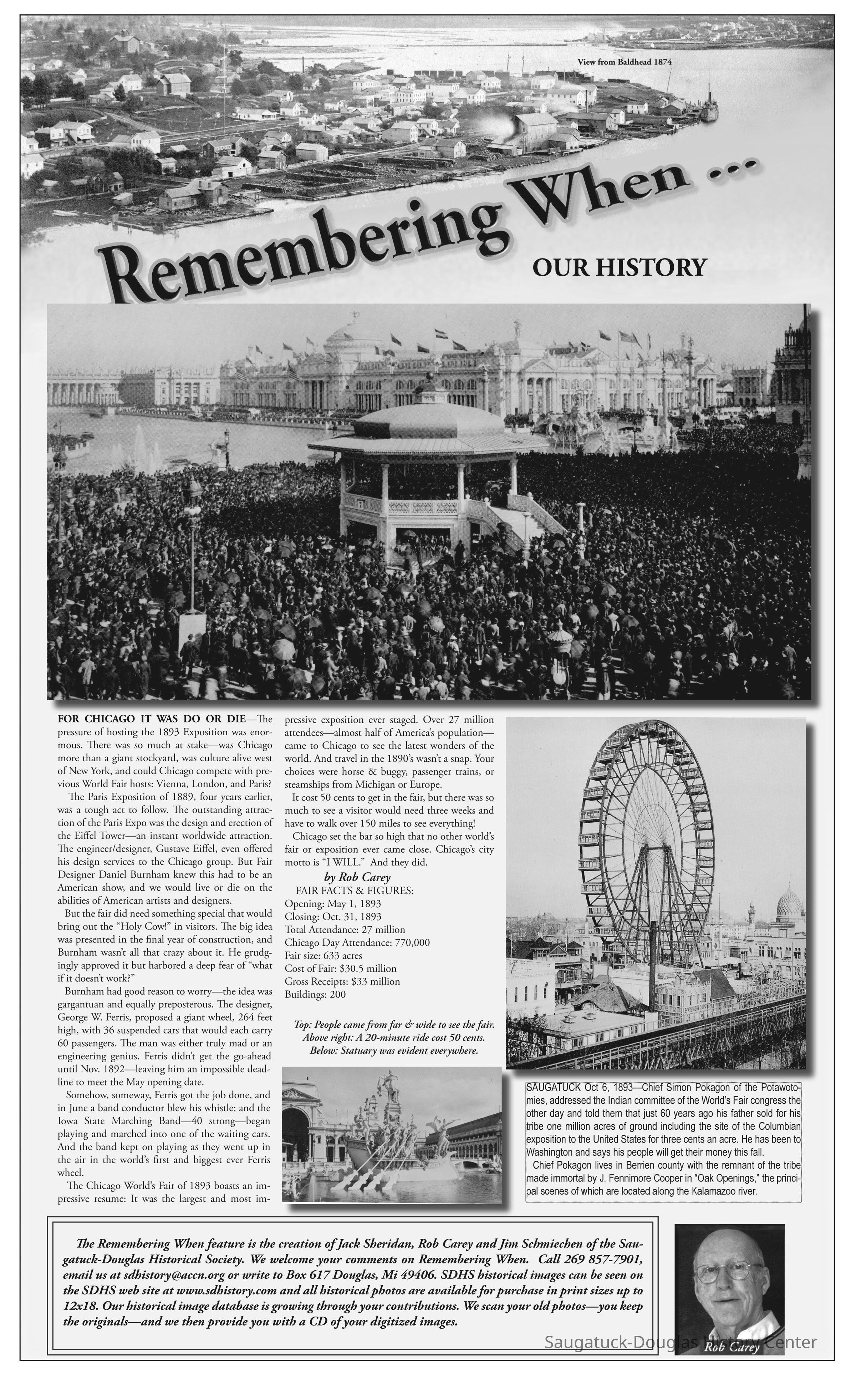 SAUGATUCK Oct 6, 1893—Chief Simon Pokagon of the Potawotomies, addressed the Indian committee of the World’s Fair congress the other day and told them that just 60 years ago his father sold for his tribe one million acres of ground including the site of the Columbian exposition to the United States for three cents an acre. He has been to Washington and says his people will get their money this fall.