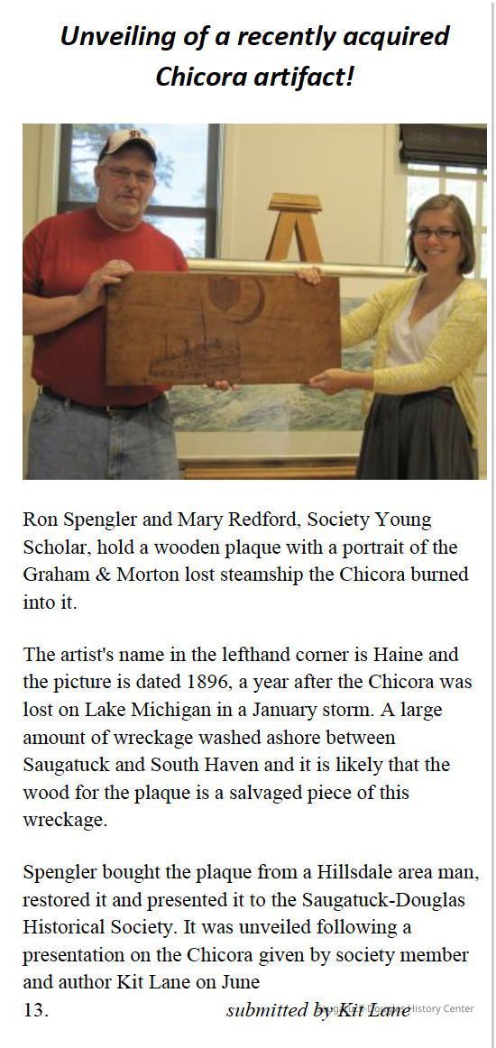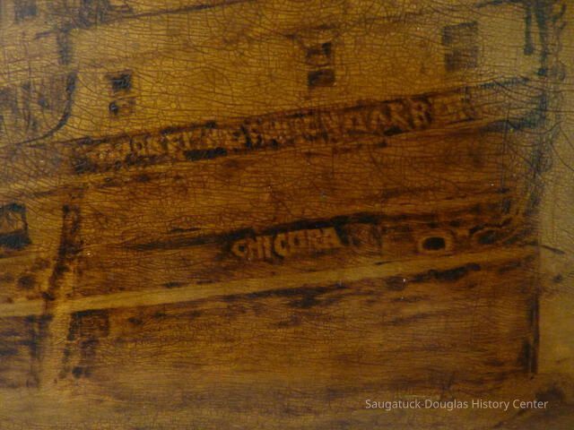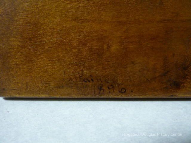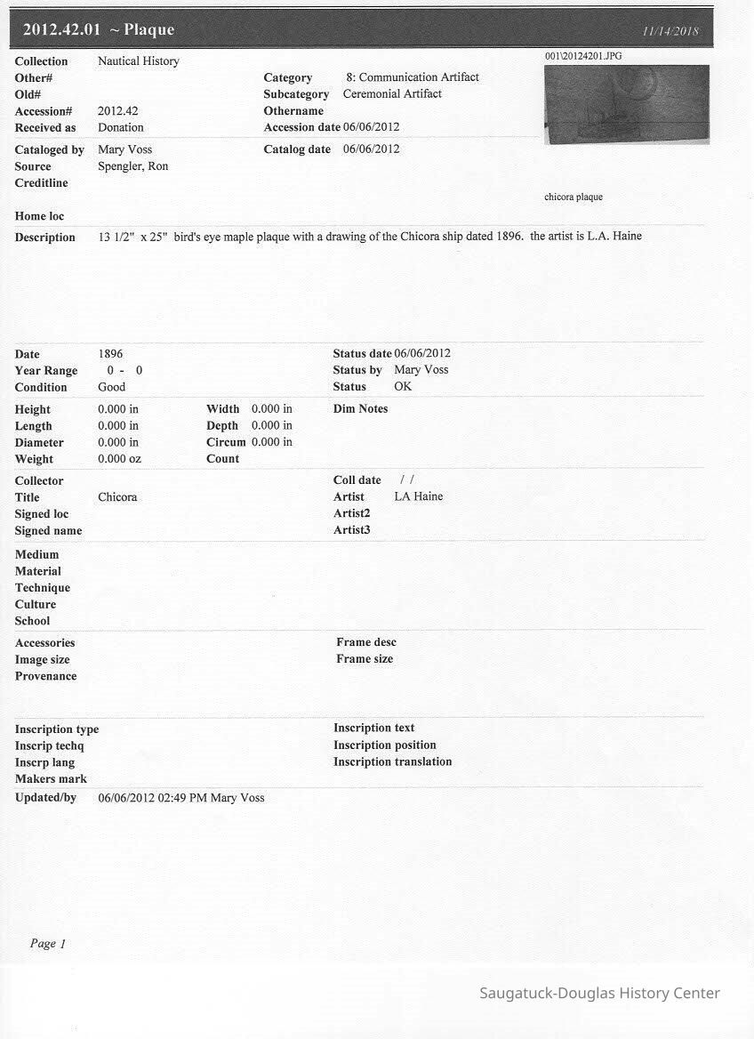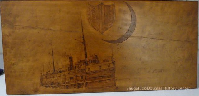 13 1/2" x 25" bird's eye maple plaque with a drawing of the Chicora ship dated 1896. the artist is L.A. HaineCollection