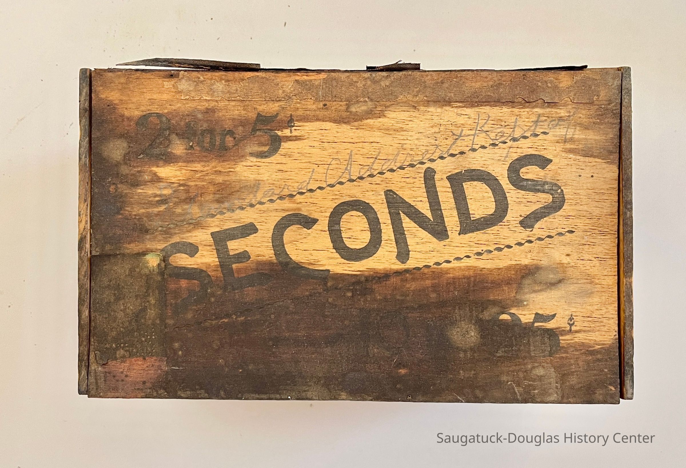 Box B. Seconds 2 for 5 cents 9 x 5 x 5.5 inches. Lid detached. Stamped on bottom of box "Factory No. 70, Coll. Dist. Mich. 100"Context