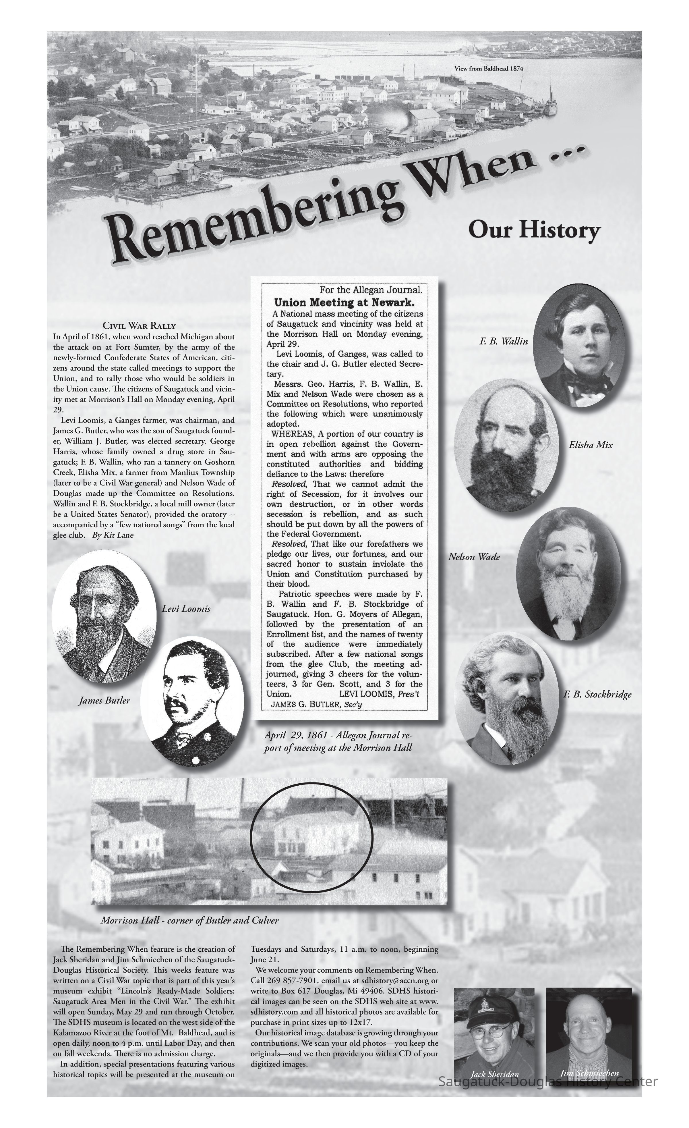 In April of 1861, when word reached Michigan about the attack on at Fort Sumter, by the army of the newly-formed Confederate States of American, citizens around the state called meetings to support the Union, and to rally those who would be soldiers in the Union cause. The citizens of Saugatuck and vicinity met at Morrison’s Hall on Monday evening, April 29.