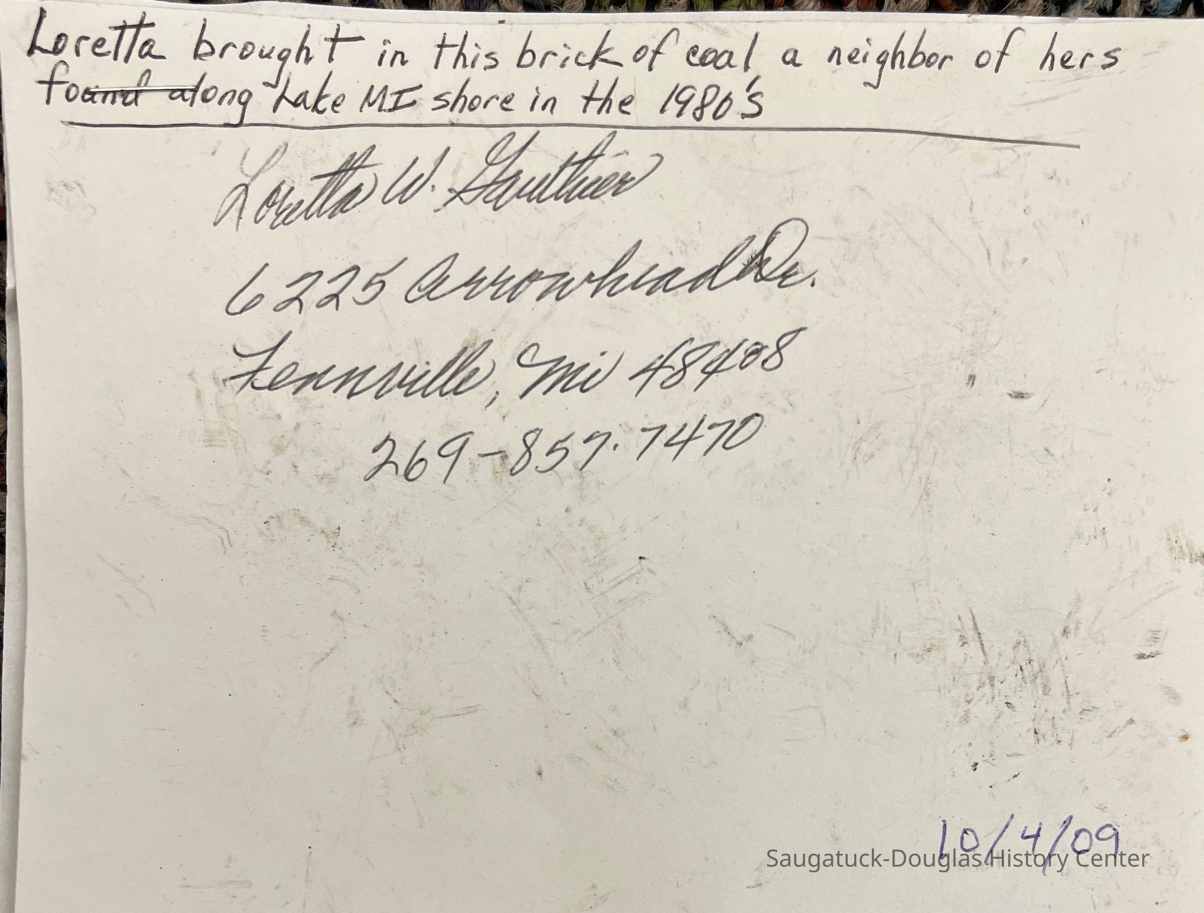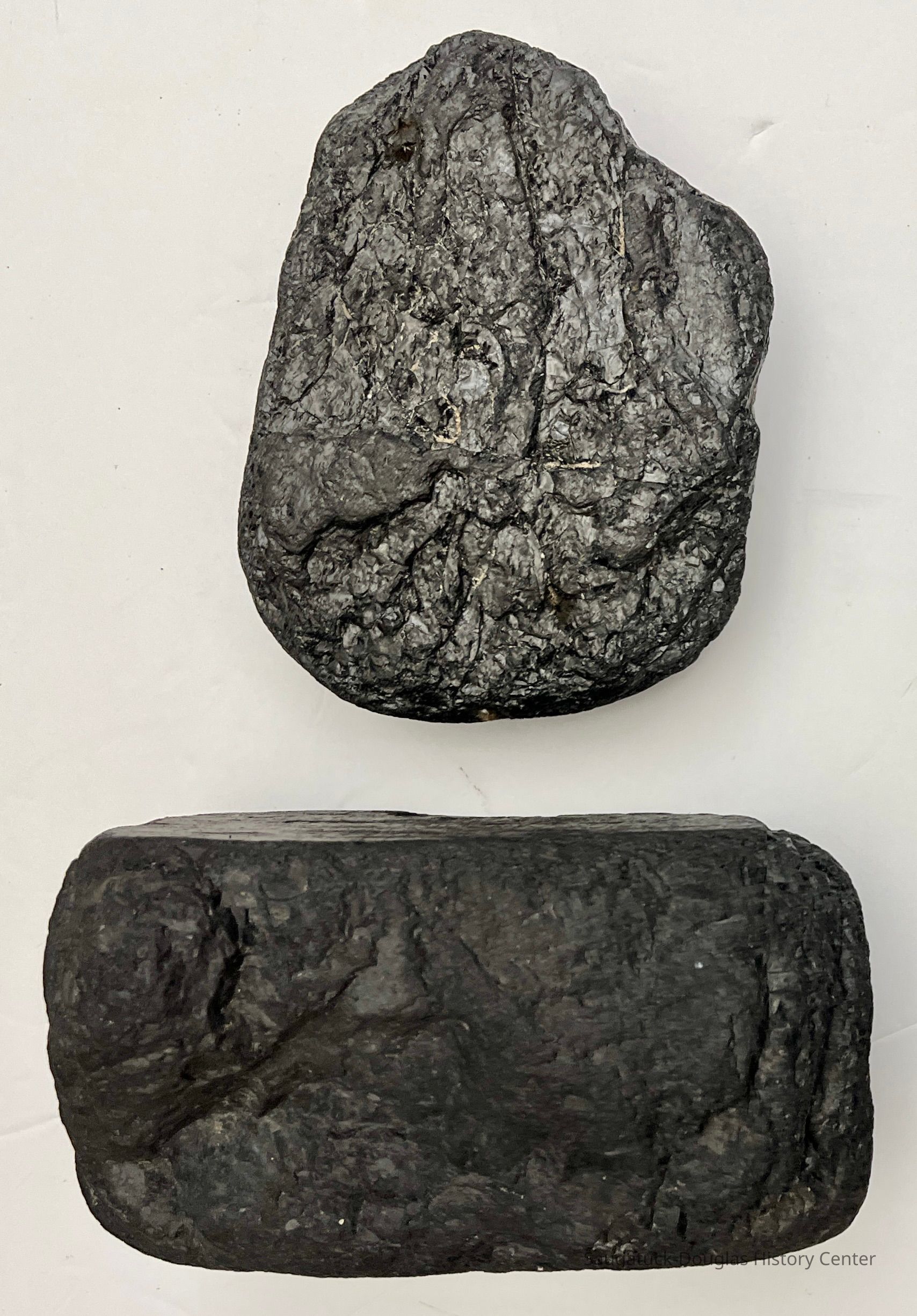 B. Brick-shaped piece of coal donated to the museum on 10/4/2009 with note "Loretta brought in this brick of coal, a neighbor of hers found along Lake MI shore in the 1980s." Loretta is Loretta Waunetta Gauthier of Fennville. 5x3x3 inchesCataloged By