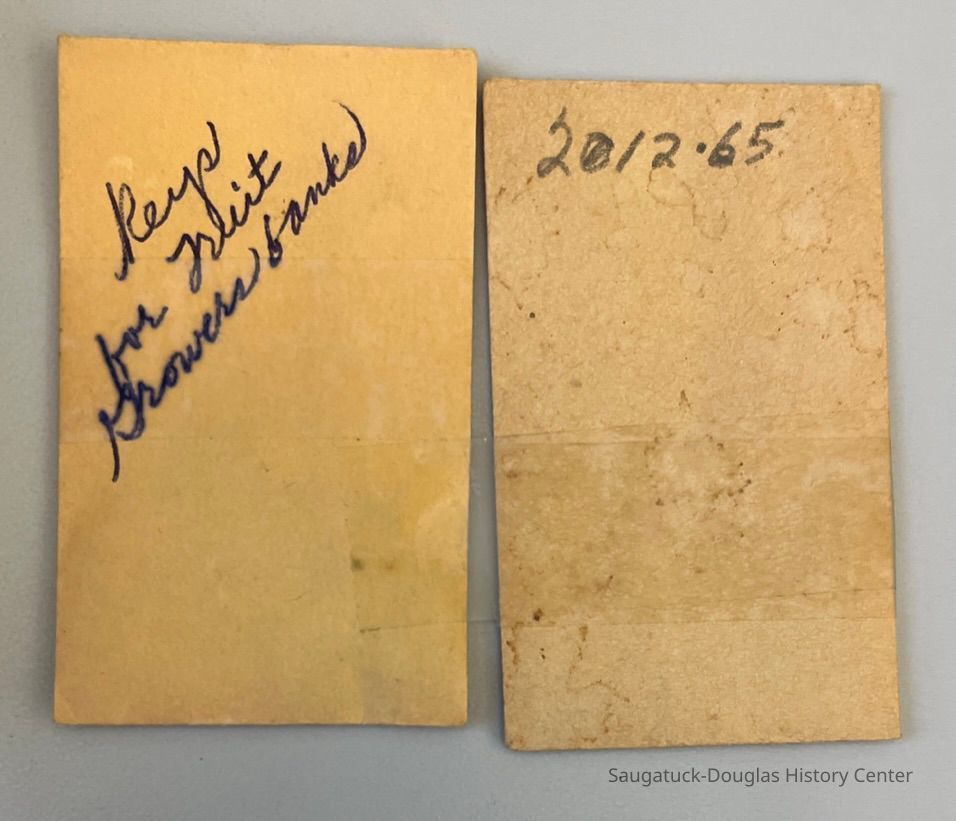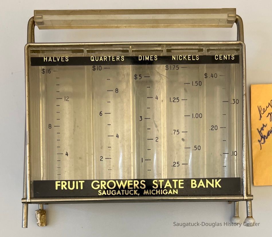 Stacking Coin Bank from the Fruit Growers State Bank, Saugatuck, MI with two envelopes of keys. The bank has five slots in the front for each kind of coin (halves, quarters, dimes, nickles and cents or pennies) and a slot in the back for currency (bank notes, dollar bills). The transparent walls allowed the saver to see how their money stacked up.Collection