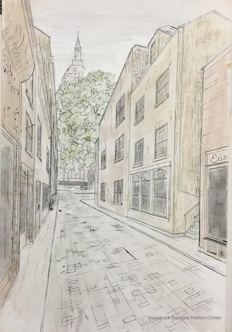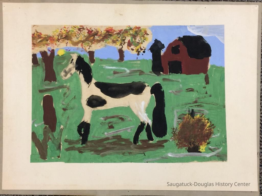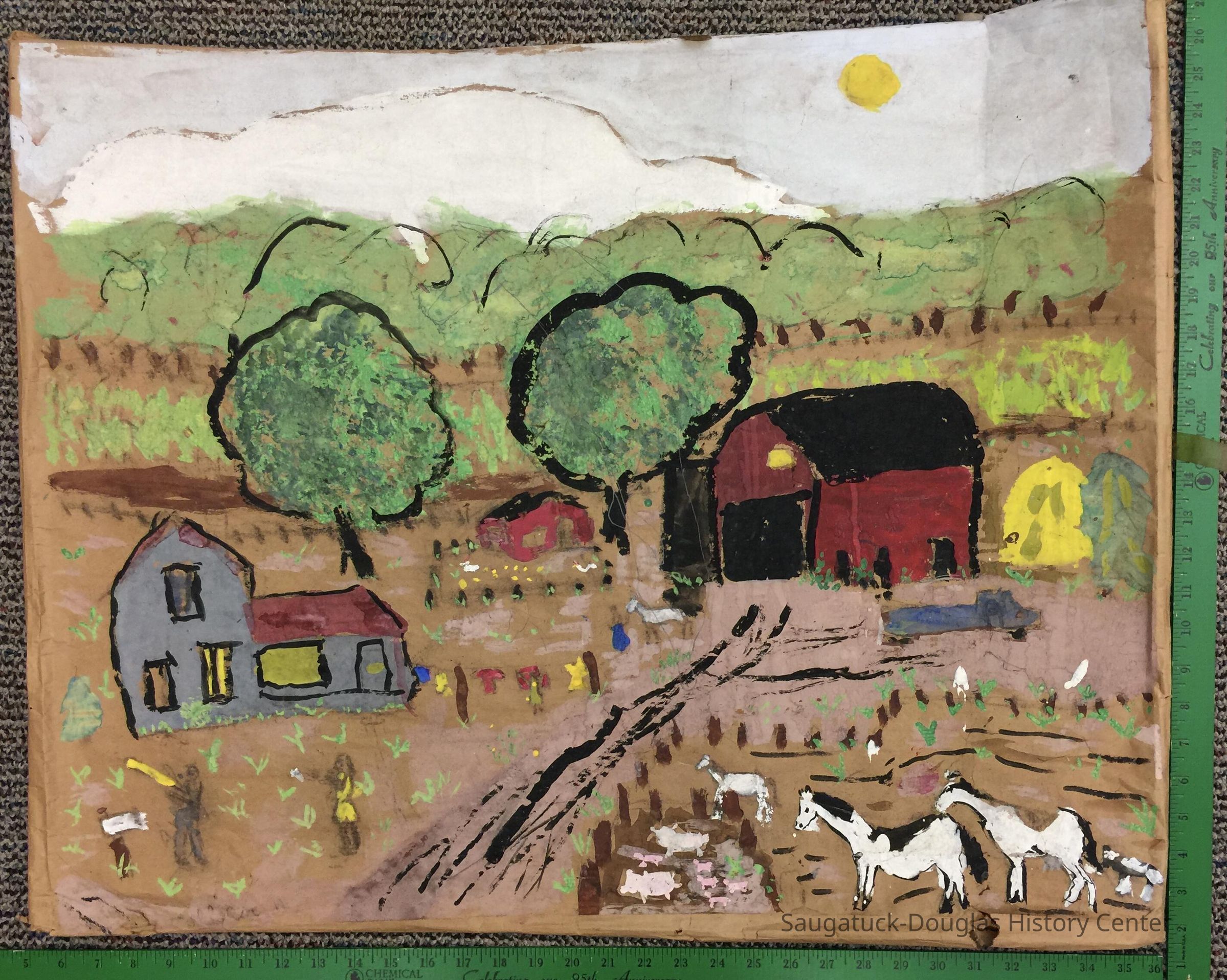 a. Farm scene with grey farm house on brown craft paper. Likely from Taylor Art School. 24x30"