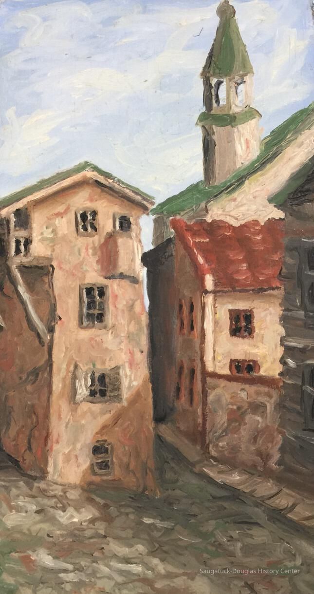 i. Panel painting of a European style structures with red and green roofs. 19x10"Type of Painting