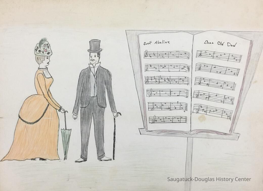 c. Victorian couple and "Dear Old Dad" sheet music on stand. 22x28"