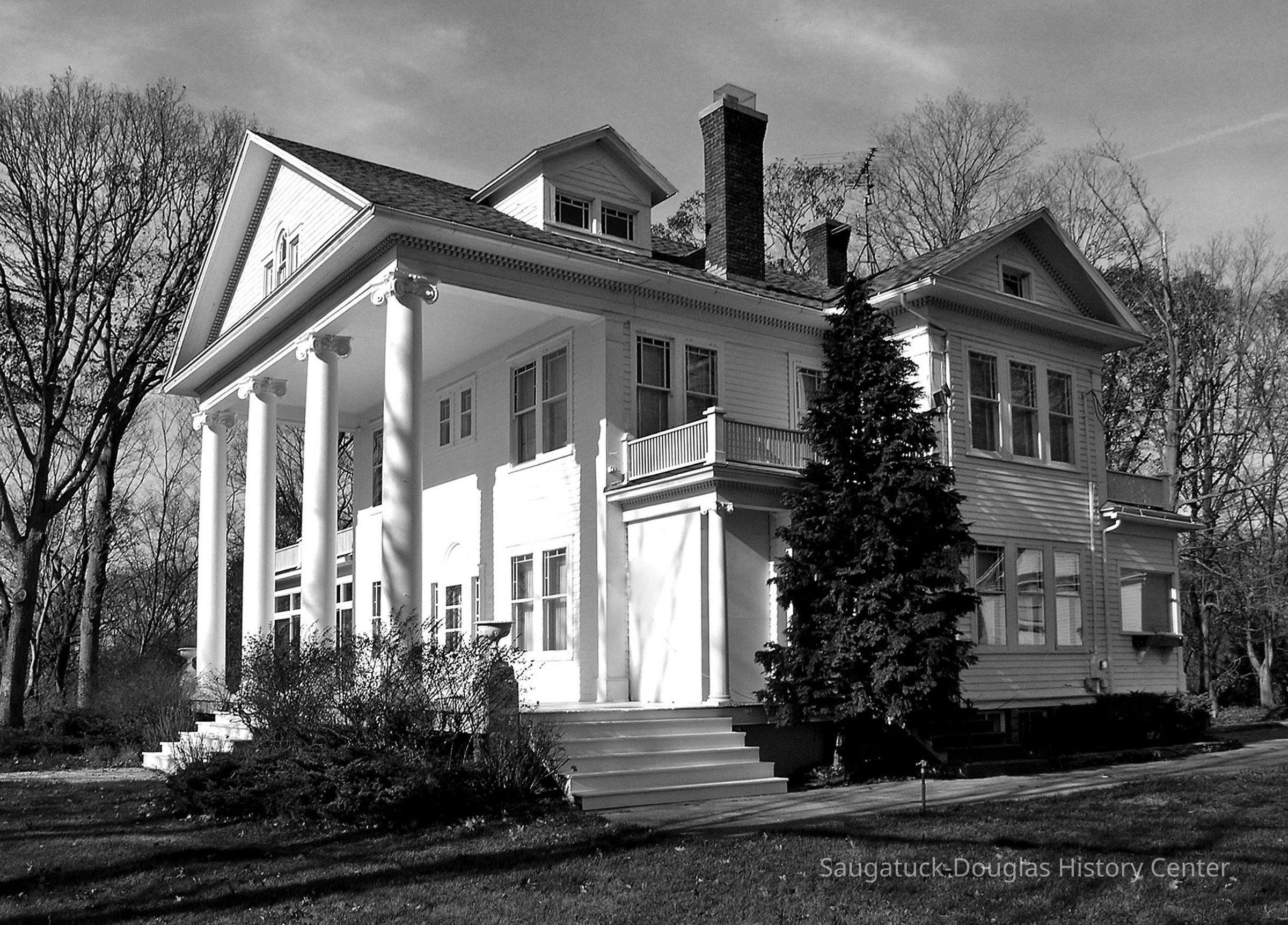 Left - The Cook – Bennett – Denison Mansion. (1916) Old Dugout Road.One of Saugatuck area’s principal icons—standing high on the bluff at the harbor entrance. David Cook was a Chicago publisher of Sunday school literature and financial benefactor of the programs of Reverend Gray’s Forward Movement Camp (now Presbyterian Camp). The Cooks owned much of the lakefront and donated considerable riverfront property to Saugatuck. The Colonial Revival mansion, which once was a mecca for rich and powerful Democrats during the Truman administration, is now empty.