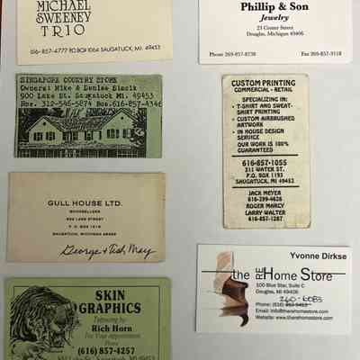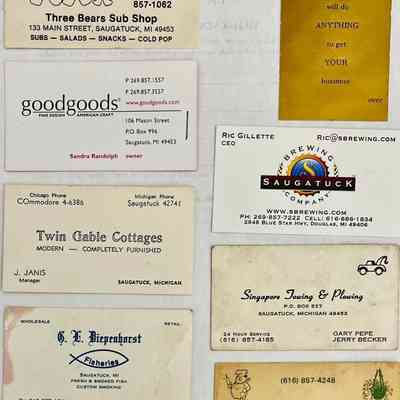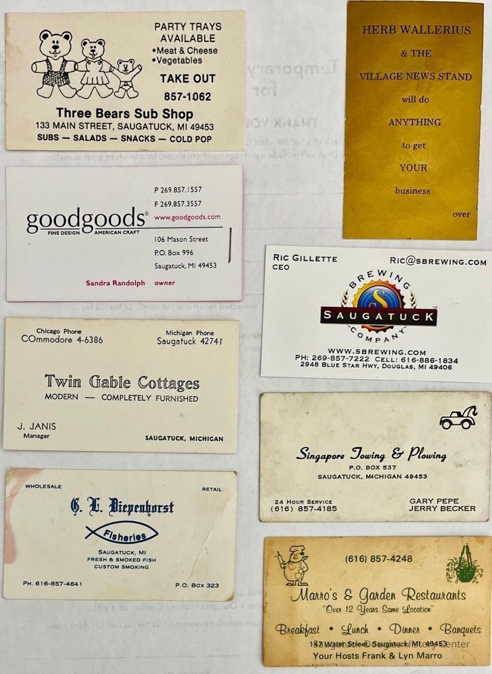 4. Business cards from Three Bears Sub Shop at 133 Main, Good Goods at 106 Mason, Twin Gable Cottages by J. Janis, G.L. Diepenhorst Fisheries, Herb Wallerius and the Village News Stand, Ric Gillette of Saugatuck Brewing, Singapore Towing and Plowing by Gary Pepe and Jerry Becker, Marro's and Garden Restaurants by Frank and Lyn Marro at 147 Water Street.