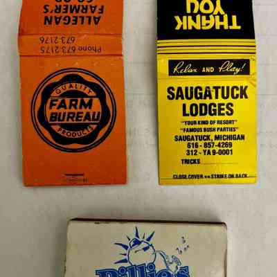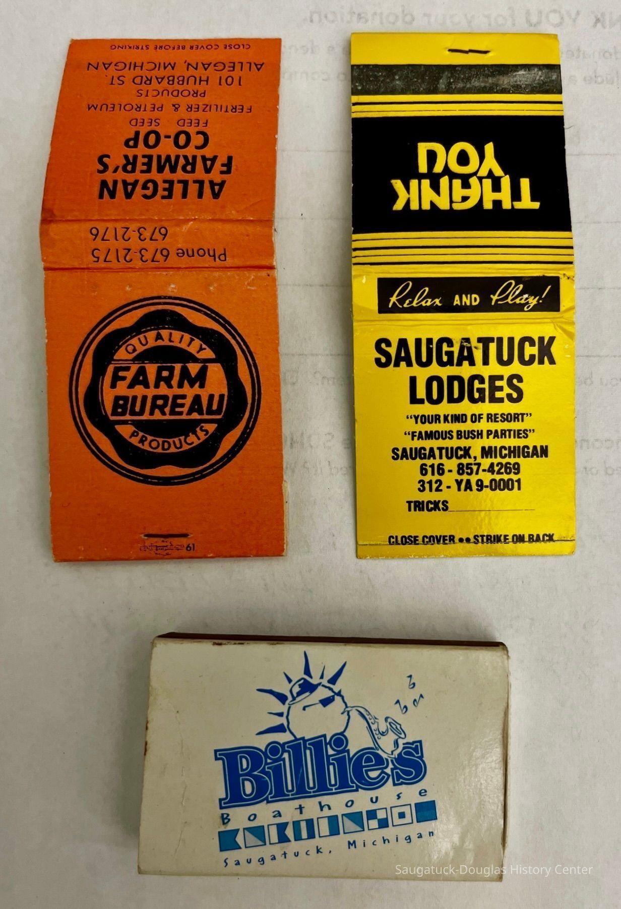 11. Paper matchbooks from Allegan Farmer's Co-op at 101 Hubbard Street in Allegan, Saugatuck Lodges with "famous bush parties." Matchbox from Billie's BoathouseContext
