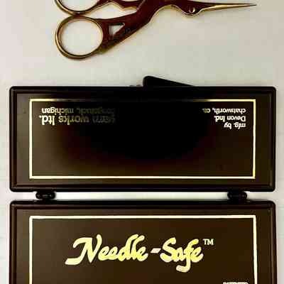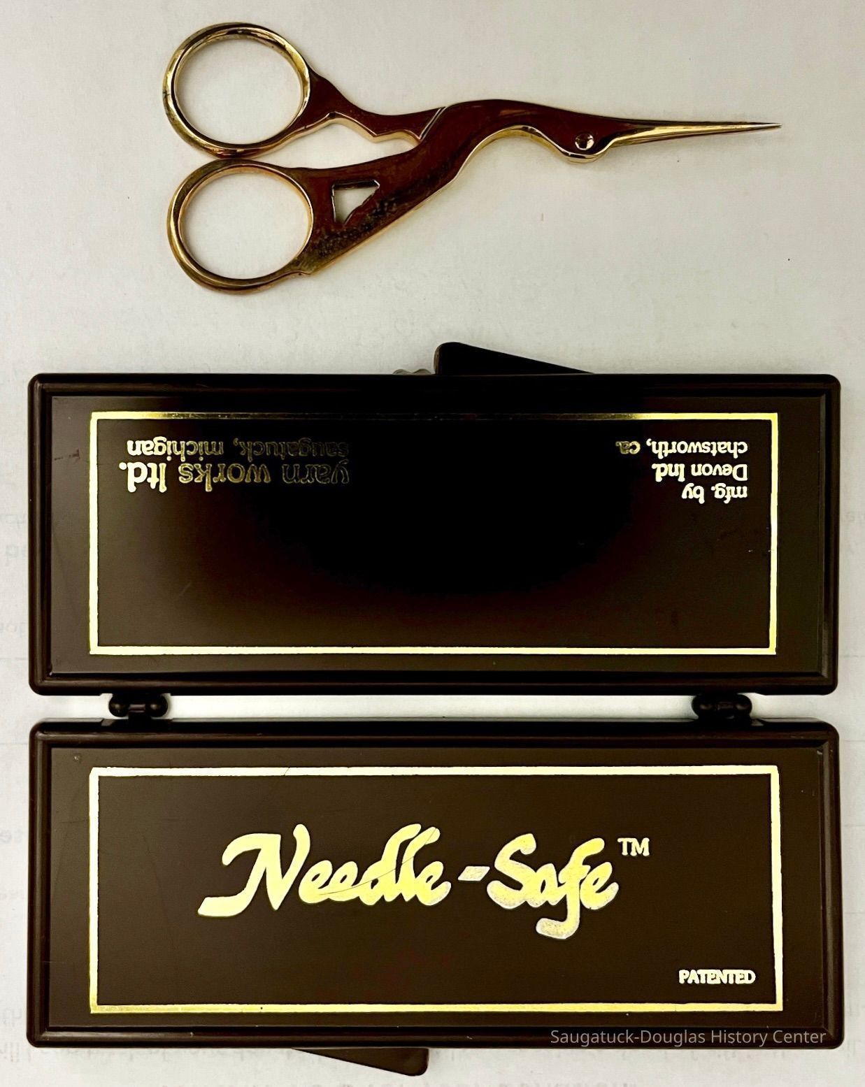 3. A black-brown, hinged plastic case imprinted with the text "Needle-Safe" and "Yarn Works Ltd Saugatuck, Michigan" that contains a small pair of gold scissors shaped like a stork.