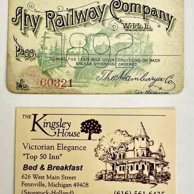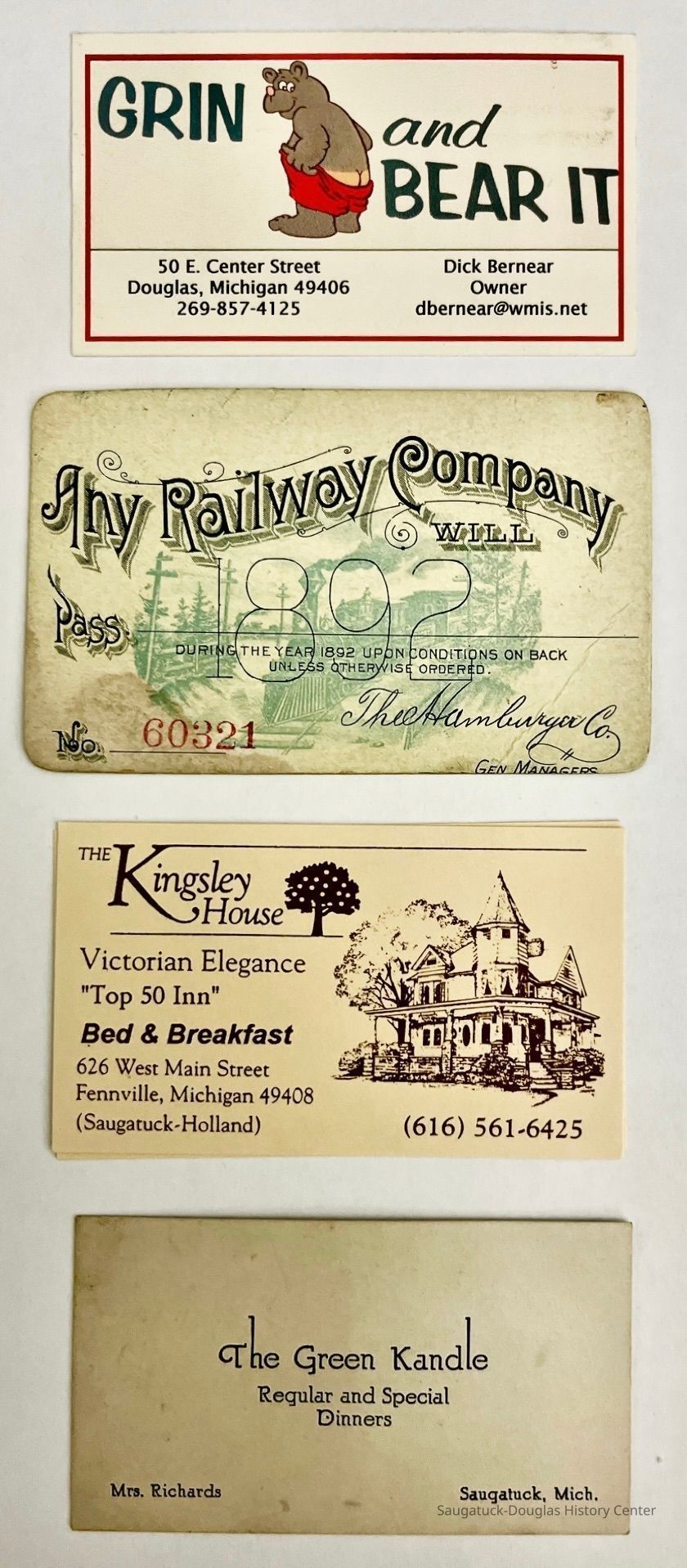 6. Business cards from Grin and Bear It by Dick Bernear at 50 E. Center Street, Any Railway Company (Hofman House Ale) , Kingsley House Bed and Breakfast at 626 W. Main Street in Fennville, The Green Kandle (dinners) restaurant by Mrs. Richards in Saugatuck