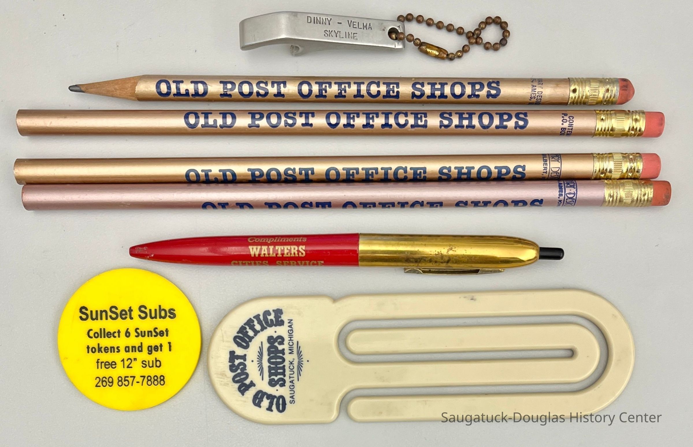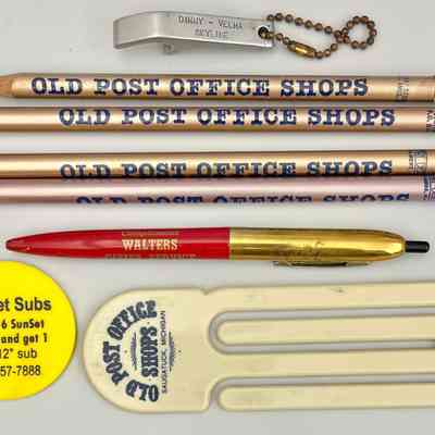 2. Three pencils and an oversize, beige plastic paper clip imprinted with the text "Old Post Office Shops"; silver-tone metal keychain bottle open with imprinted text "Dinny - Velma Skyline"; red and gold retractable ball-point pen imprinted with text "Compliments Walters Cities Service Junction US - 31 & M89" and yellow plastic token coin from SunSet Subs.