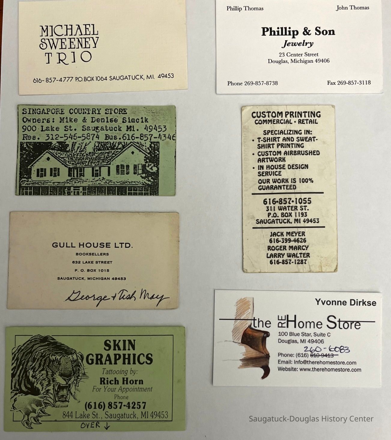 5. Business cards from Michael Sweeney Trio, Singapore Country Store by Mike and Denise Simcik at 900 Lake Street, Gull House LTD Booksellers/George and Tish May at 632 Lake Street, Skin Graphics Tattooing by Rich Horn at 884 Lake St., Phillip & Son Jewelry by Phillip Thomas and John Thomas at 23 Center Street, Jack Meyer, Roger Marcy, Larry Walter – Custom Printing at 311 Water St., the ReHome Store by Yvonne Dirkse at 100 Blue Star Highway