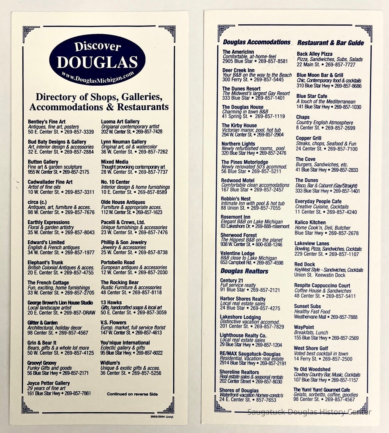 Morgan Ice Company, 238 Butler/James Brandess Gallery/Old Post Office Shops, 115 Butler/Beach Day/MI Coast/Music Box/John Ball's Restaurant/Niles Jewelery 1910, 133 Main/Design Shop/Whipple Sister's House, Good Goods gallery 1989-2023, 106 Mason/Good Goods/White House/James Dole house/106 Mason, Janis, Jack, Hotel Saugatuck/900 Lake/Twin Gables Hotel/Singapore Country Inn, Diepenhorst, Gary Lee 1940-2024, Saugatuck Brewing Company, Marro's/Corner Grill, Marro, Frank, Marro, Lyn, Sweeney, Michael Sampson 1947-2020, May, George S., 632 Lake, 844 Holland/Peterson Grist Mill, 23-25 W Center, 311 Water/Boardwalk Deli/Dan Mather feedstore, Farmhouse Deli/Douglas Locker Plant, 50 E Center/ReDefine Med Spa & L Salon/IsWhatItIs/Gallery/Bentley's Antiques/Gas Company, Kingsley House, 229-233 Butler/Oosting Appliance Shop East/Green Kandle/Busy Bee, American Twisting Company 1923-1998, Saugatuck Lodges, 449 Water/Wicks Park Bar & Grille/Billie's Boat HouseCreate Date