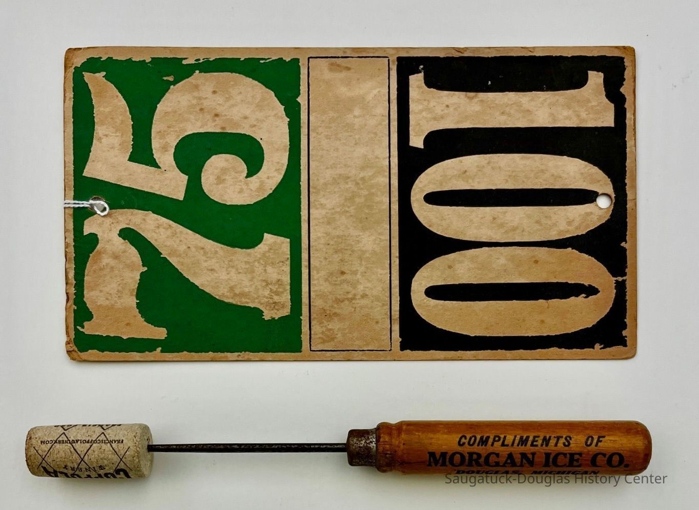 1. Ice pick with rounded wood handle imprinted with the words, "Compliments of Morgan Ice Co. Douglas, Michigan" and a Francis Ford Coppola Winery cork impaled on the pick's point. Window card printed with the numbers 25, 50, 75 and 100. The card was used for customers to communicate with ice delivery workers. The card was placed in a road-facing window to alert the iceman how many pounds of ice the customer wanted to be delivered.