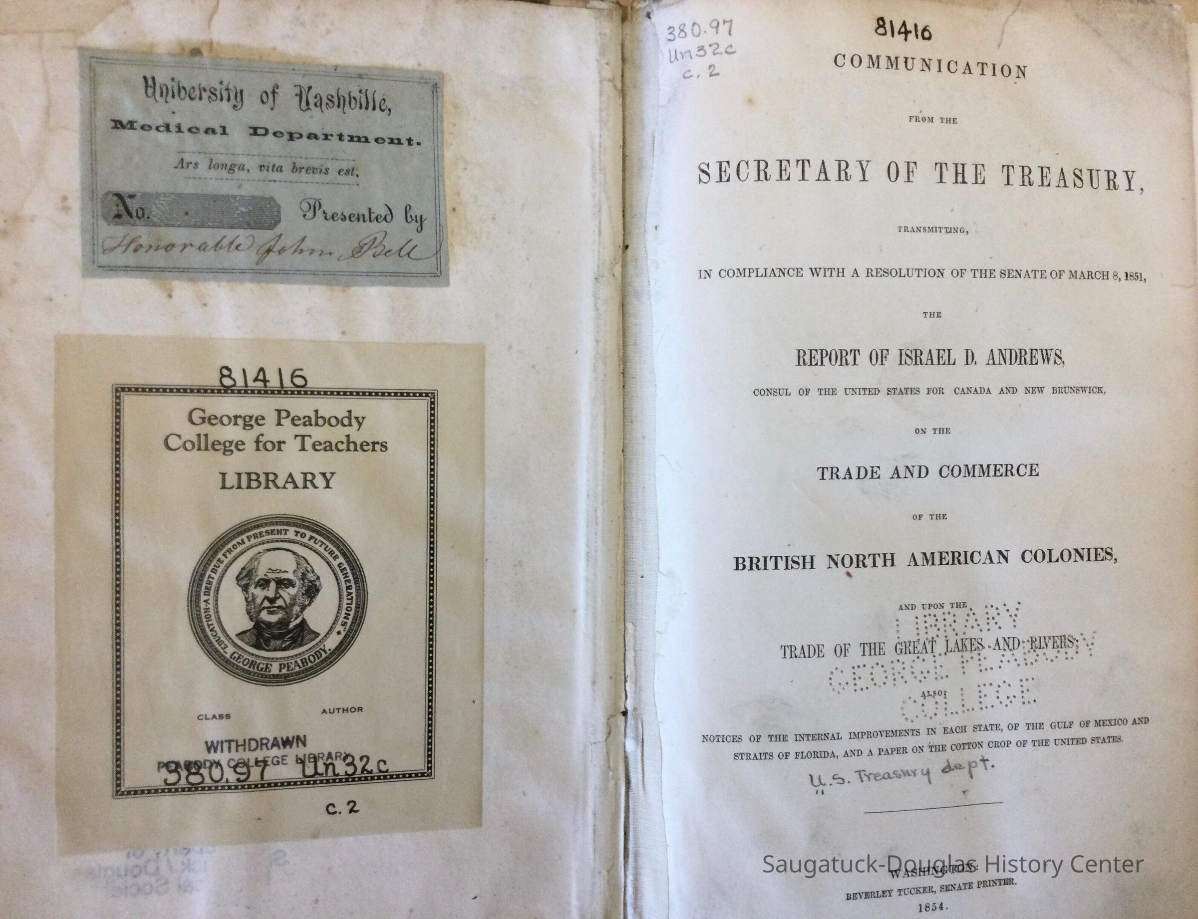 1850 for publication communication from the secretary of the treasurer transmitting in compliance with the resolution of the Senate of March 8, 1851 the report of Israel D Andrews counsel of the United States or Canada and New Brunswick. Report on trade and commerce of the British North American colonies and upon the trade of the great lakes and riversCataloged By