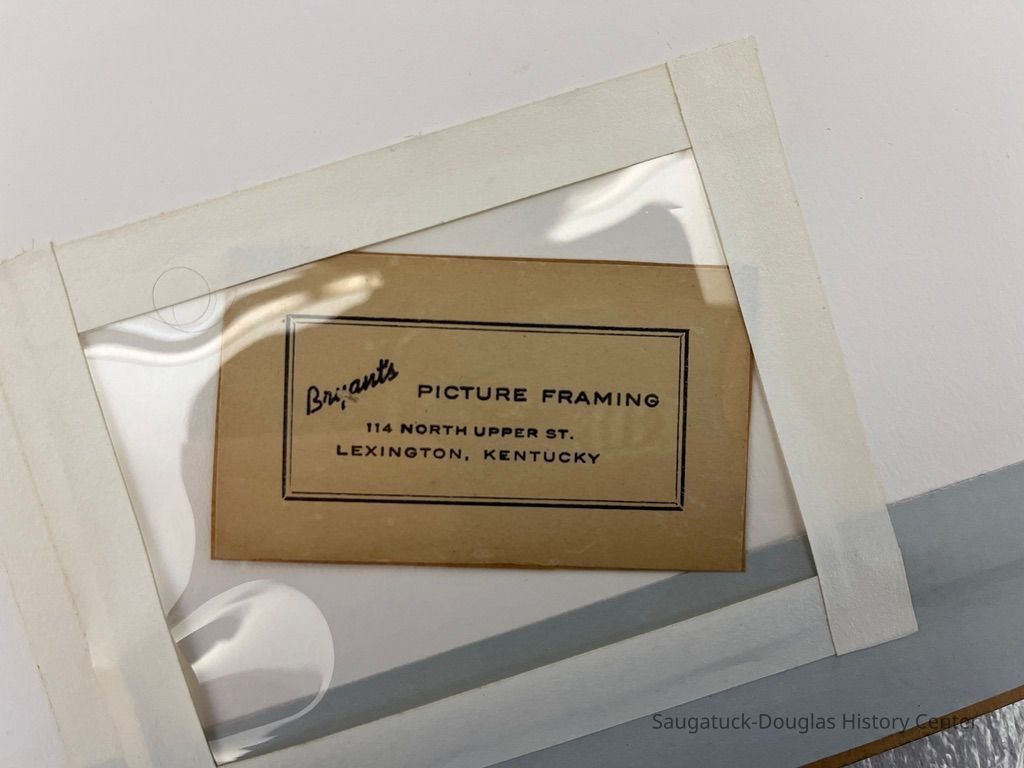 The back of the frame has a small pocket holding a tag for Bryant's Picture Framing, 114 North Upper St., Lexington, Kentucky.Collection