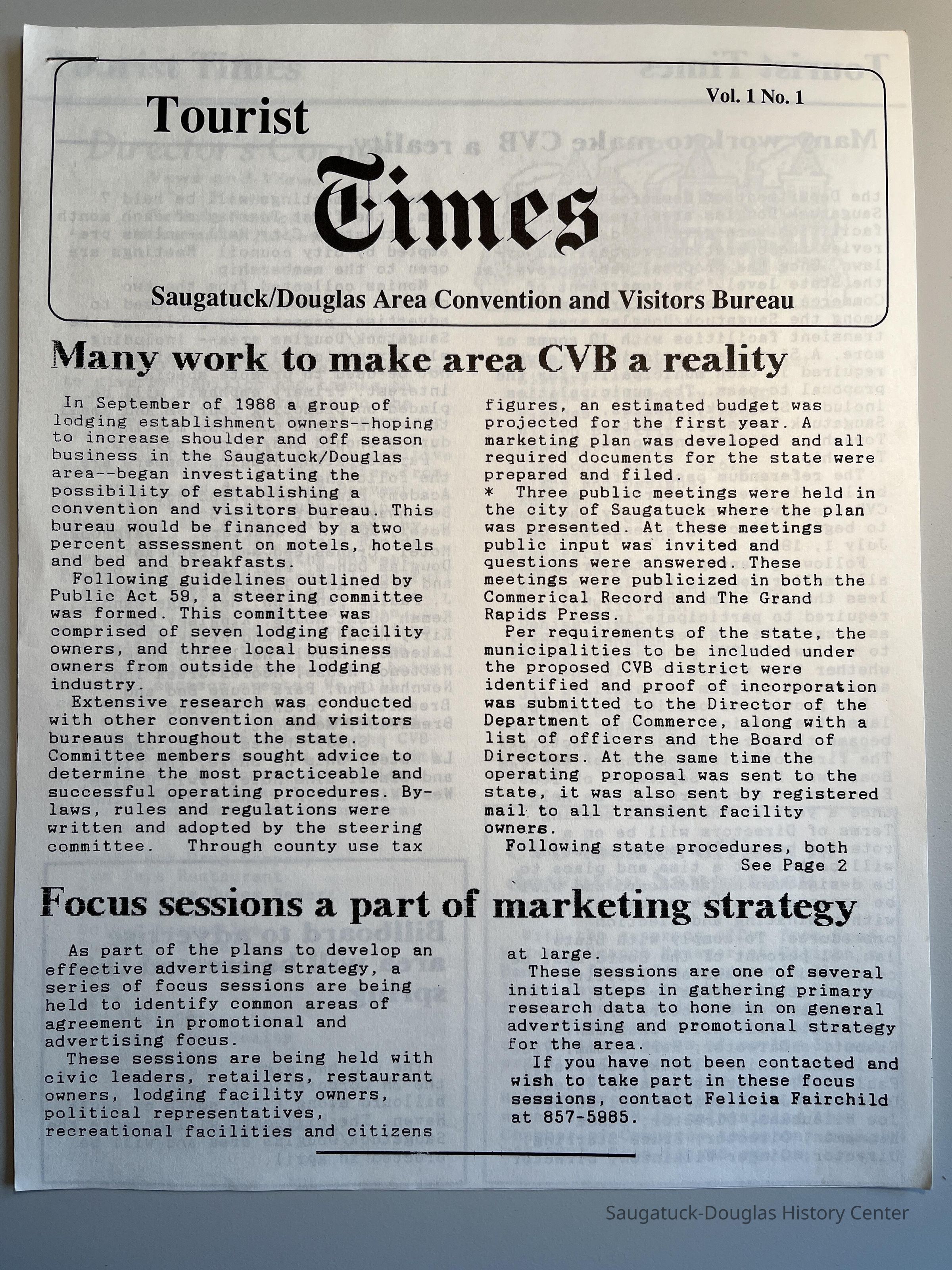 1. Circa 1990 photocopied six-page "Tourist Times" Volume 1, Number 1, published by the Saugatuck/Douglas Area Convention and Visitors Bureau. (CVB). Articles explaining the formation of the CVB, marketing strategy, plan to erect a billboard, report of Harvest Festival, new office location in Citizen's Bank, Circe Tour rebate, Chris Conrad's WEVS - a radio station that broadcast from downtown Saugatuck, planned Murder Mystery weekends and Saug-a-duck, booth at 1990 Chicago Boat Show, After Five program, Jim Miscissin photographers, National Federation of Independent Businesses request to write letters of protest about HR 2273 and 5933 "The Americans with Disability Act"