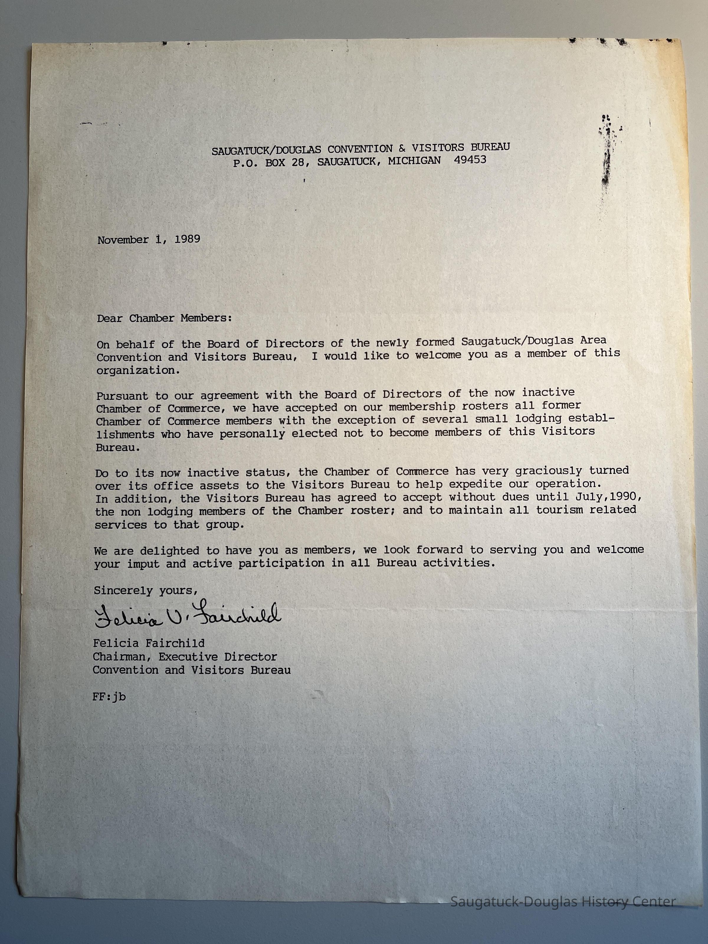 2. Nov. 1, 1989 Letter from Felicia Fairchild, CVB chairman, to Saugatuck Chamber of Commerce members welcoming them into the new organization.Context