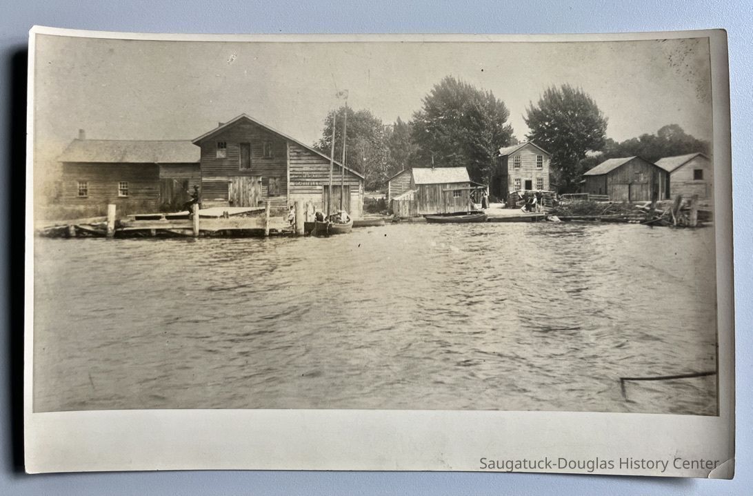 The structures on the right side of the image is the Cook Boat House, a boat livery yard. A man is fishing with a pole from a perch a piling. This site later became the Tourists' Home hotel. "Cook Boat House" and "Boats to Let" written on the building behind the sailboat.