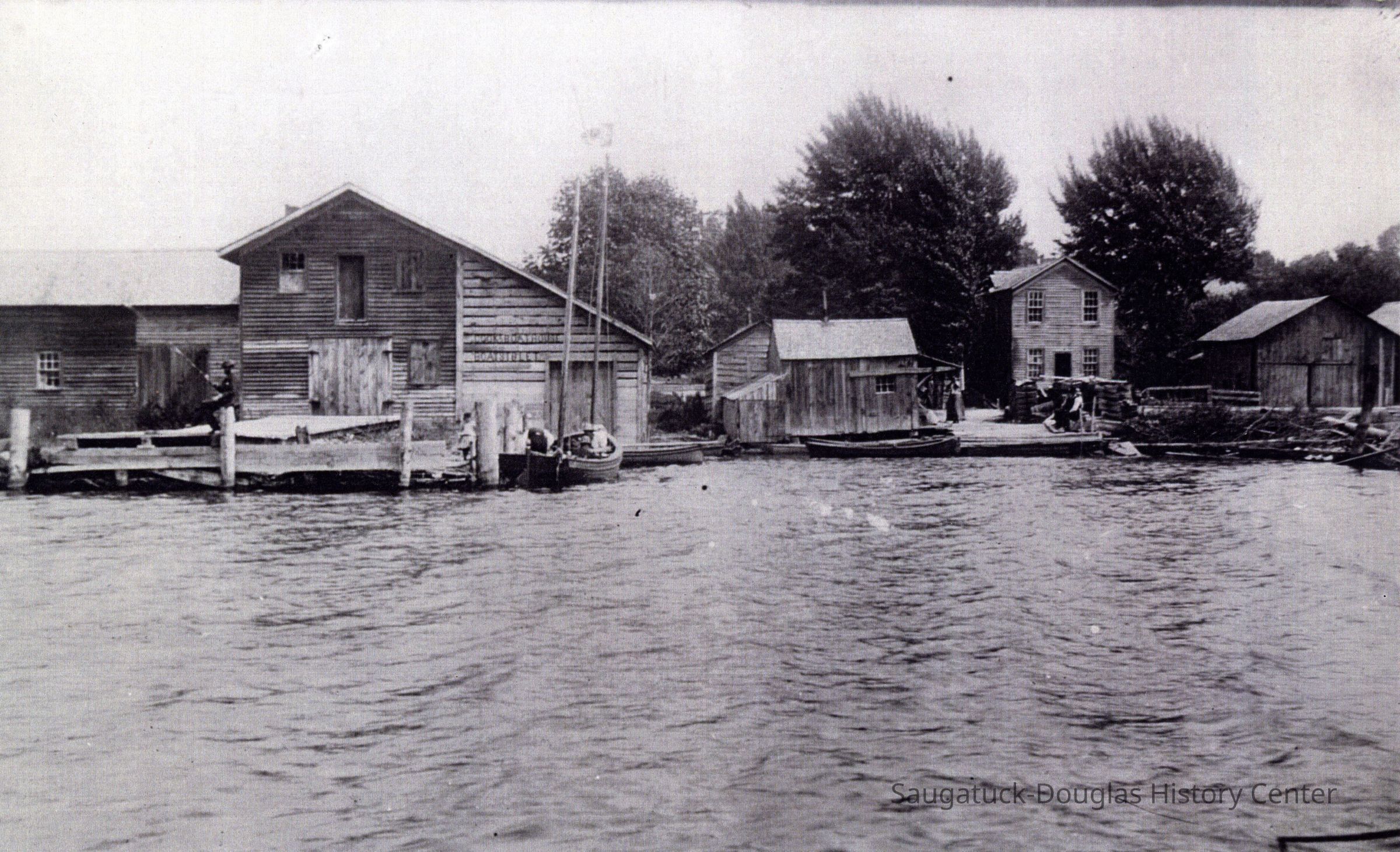 The structures on the right side of the image is the Cook Boat House, a boat livery yard. A man is fishing with a pole from a perch a piling. This site later became the Tourists' Home hotel. "Cook Boat House" and "Boats to Let" written on the building behind the sailboat.
