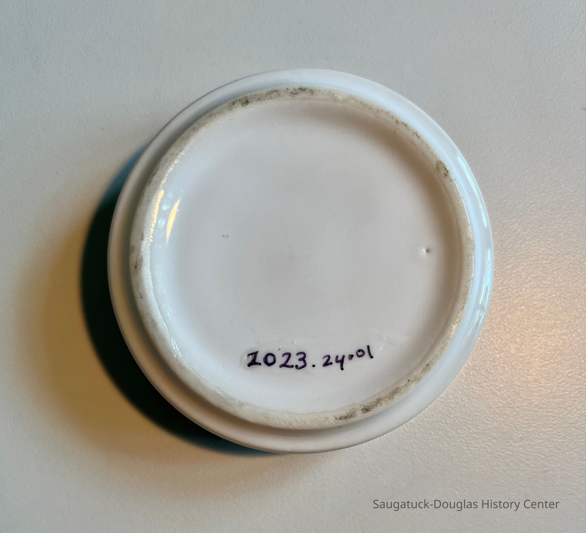 White, circular ceramic ashtray with single notch. The floor of the ashtray is printed with a logo for the Copper Grill that includes a stylized smiling face and sun rays. The ashtray has a gloss glaze and a stripe of gold paint on the upper lip.Context