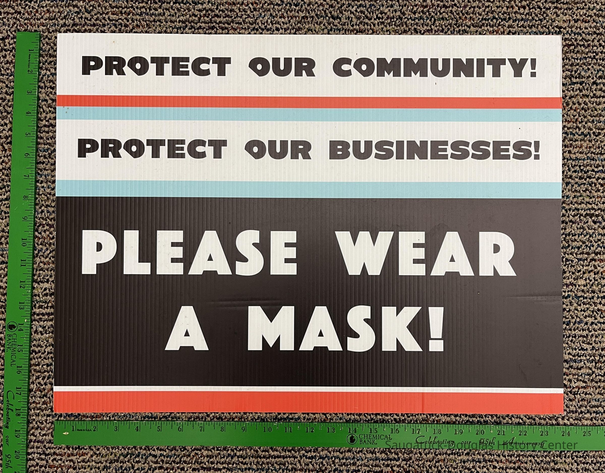 a. Protect our community! Protect our businesses! Please wear a mask - sign displayed at the onset of the COVID-19 pandemic as tourism businesses (led by Elizabeth Estes of Isabel's market) sought to get ahead of health concerns.