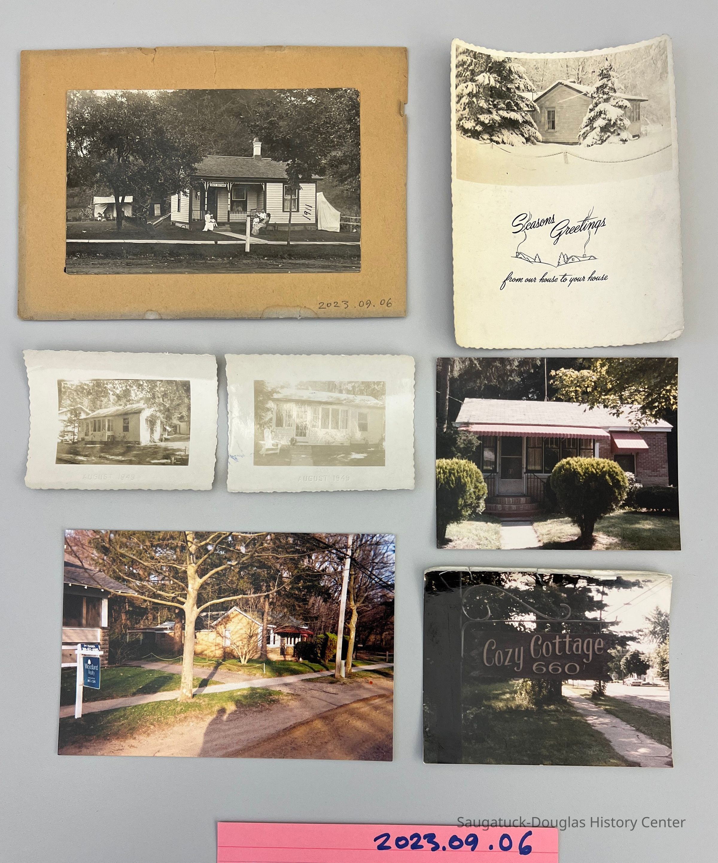 Seven loose photos of the Morris family's "Cozy Cottage" at 660 Lake Street in Saugatuck. More photos of the cottage are in the Morris family albums.Photograph Details