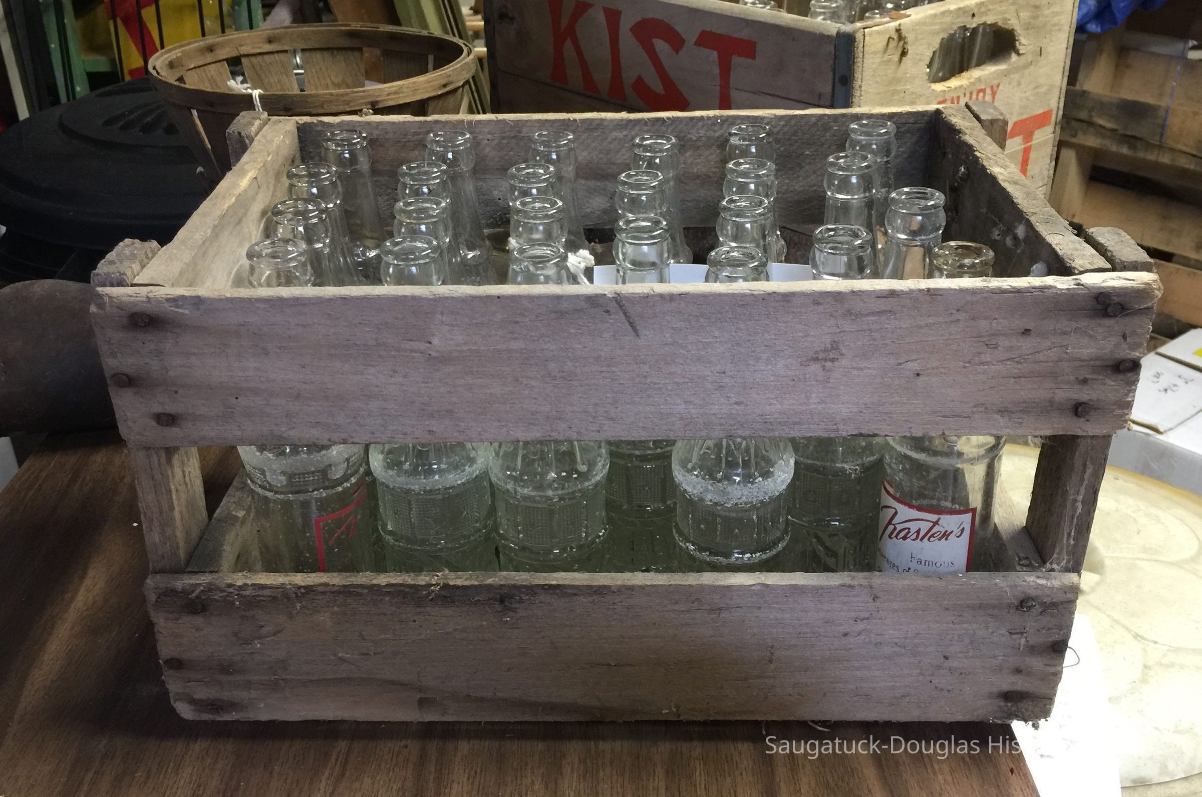 Three wooden crates loaded with soda bottles, some from the local Kasten's distributor. The plank-built crates have no branding and are held together with nails.
