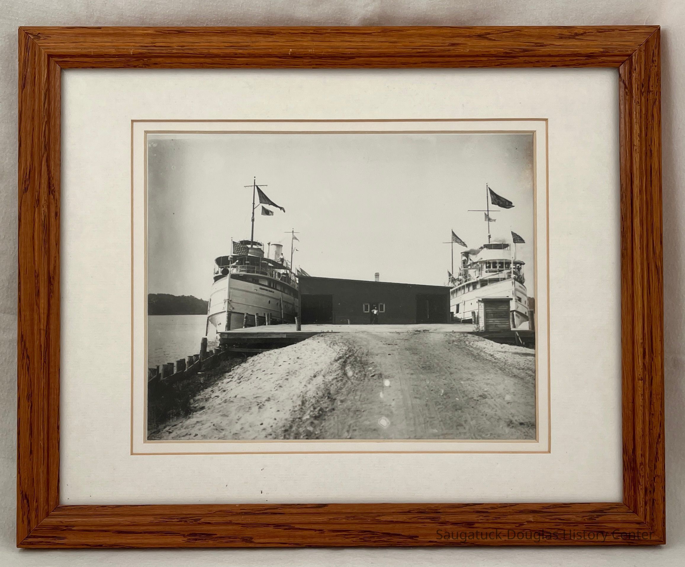 B/W photographic print of two Crawford Transportation Company steamers at the Crawford Dock, circa 1909-1913