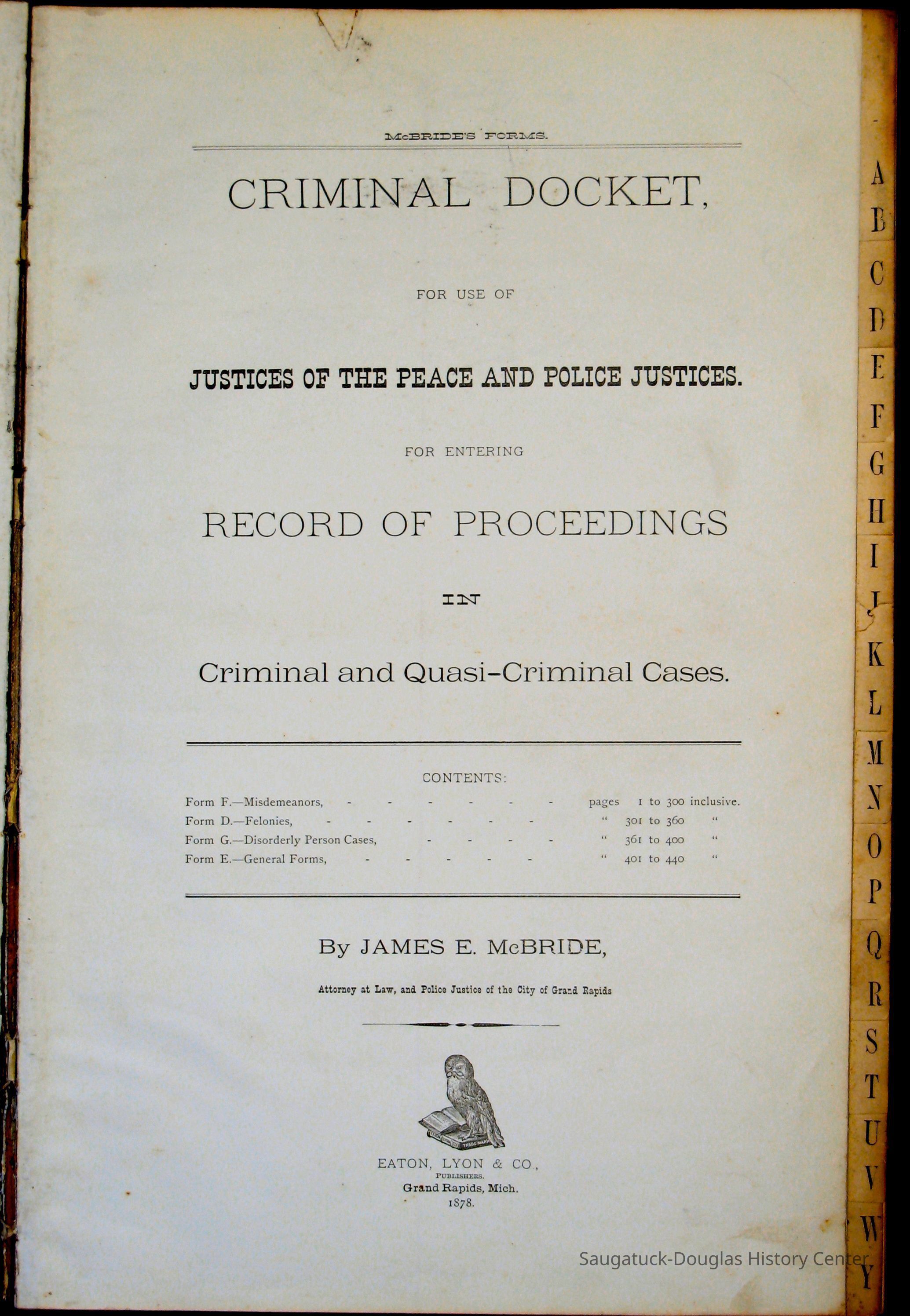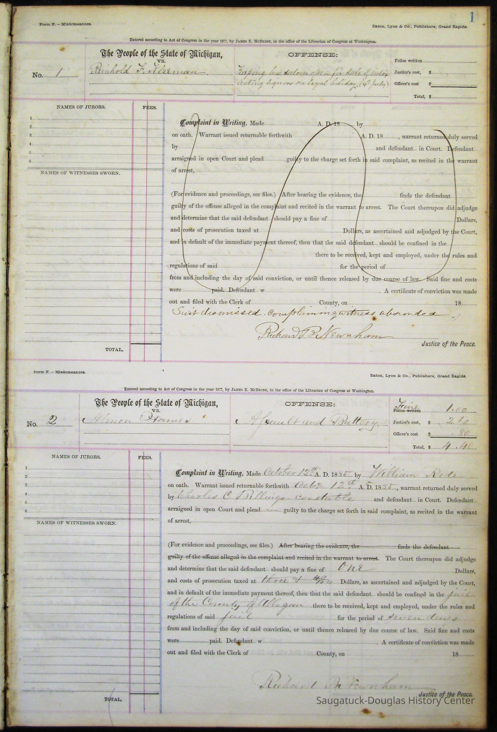 Scan of the Saugatuck Township Criminal Docket, an official record of charges heard by the Justice of the Peace. Each page documents two cases and lists who was charged, what crime, and what action was taken. This book records crimes and punishments from 1885 to 1934.