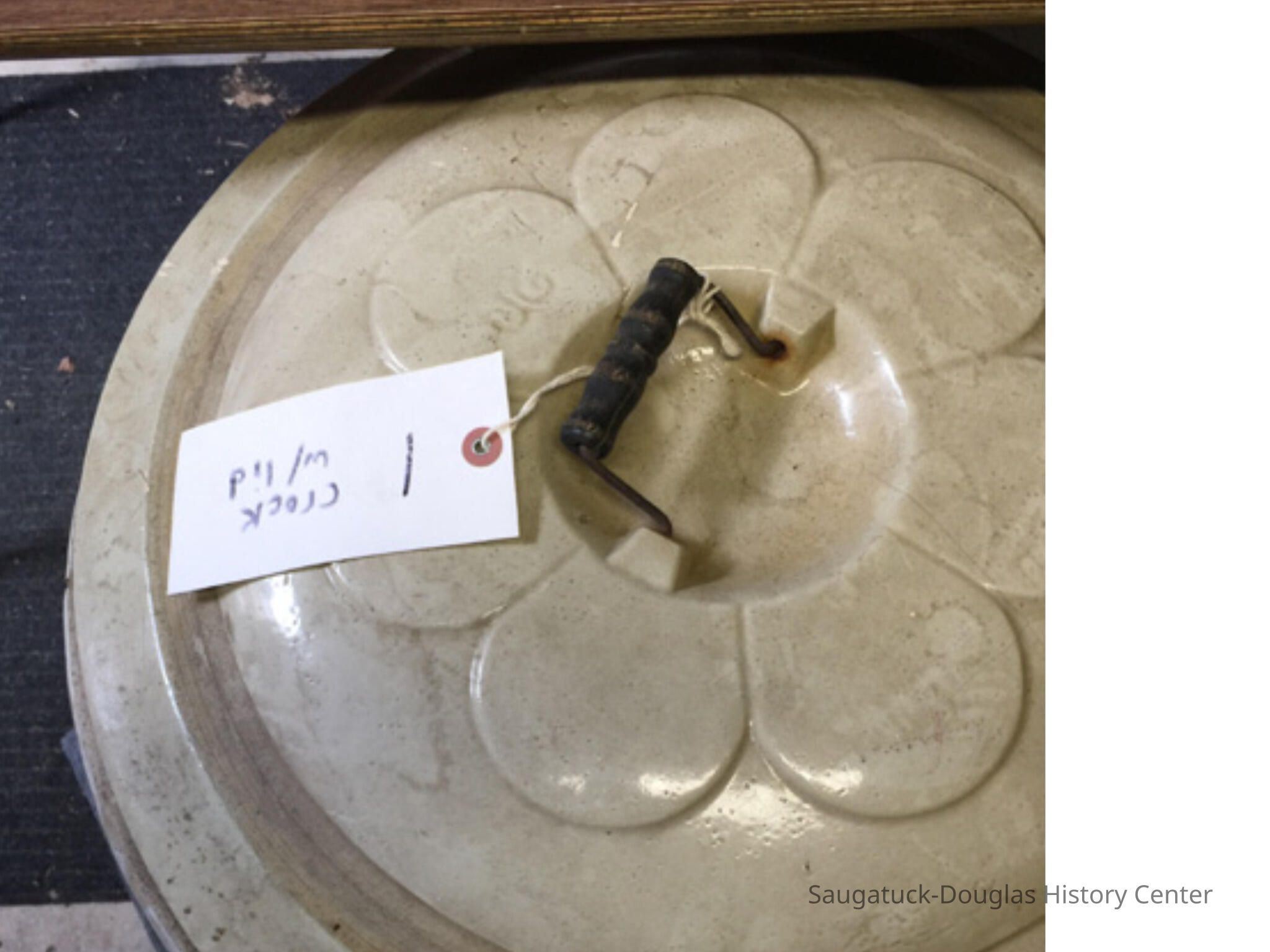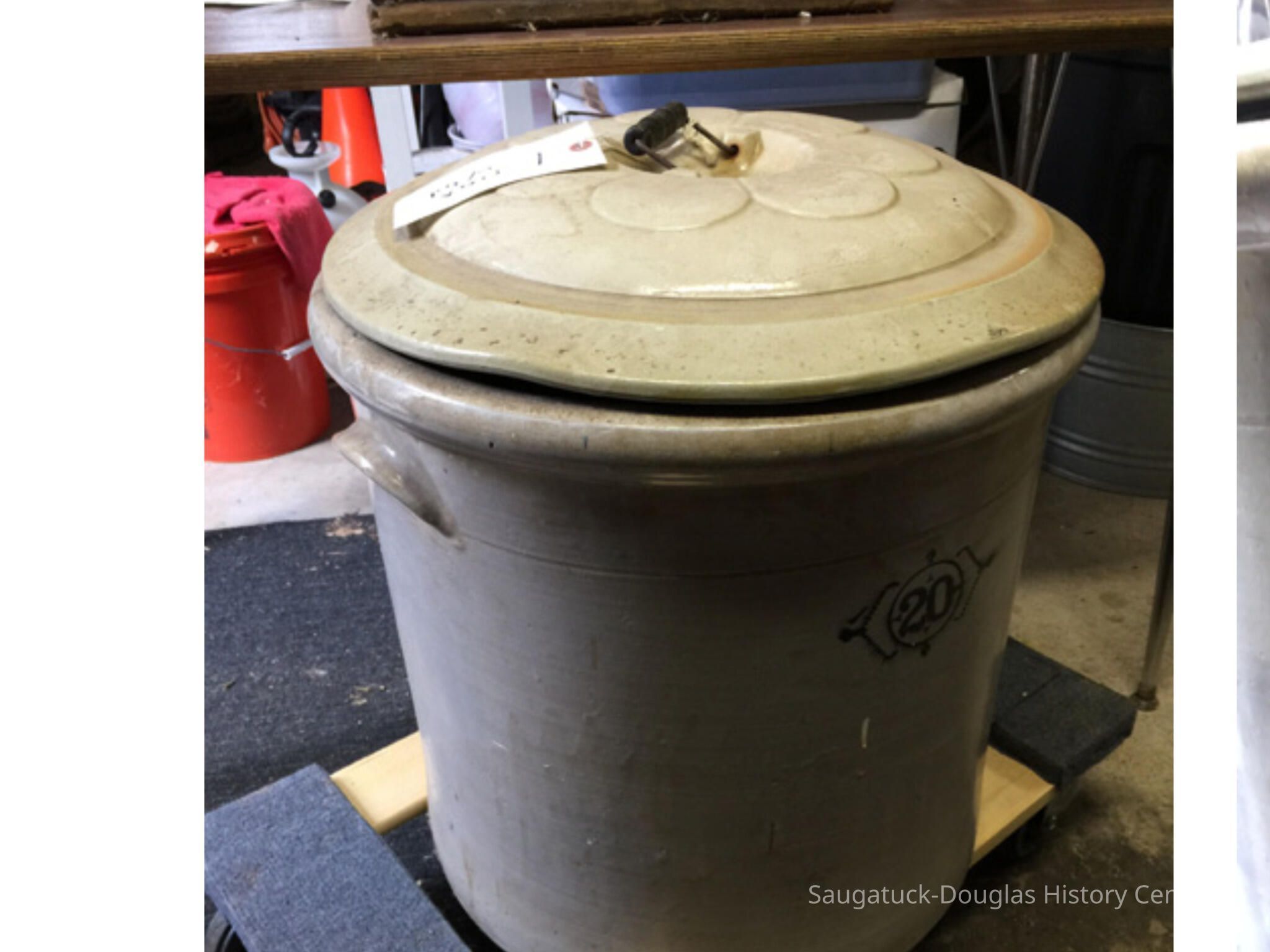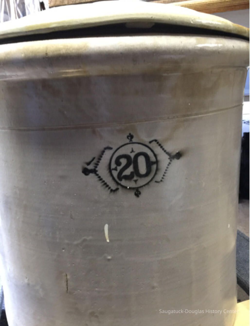 20 gallon stoneware crock that was found in the sand at the site of the old Singapore settlement in 1953. Donor stated that lid came from another source and he paired it with the crock at a later date.Collection