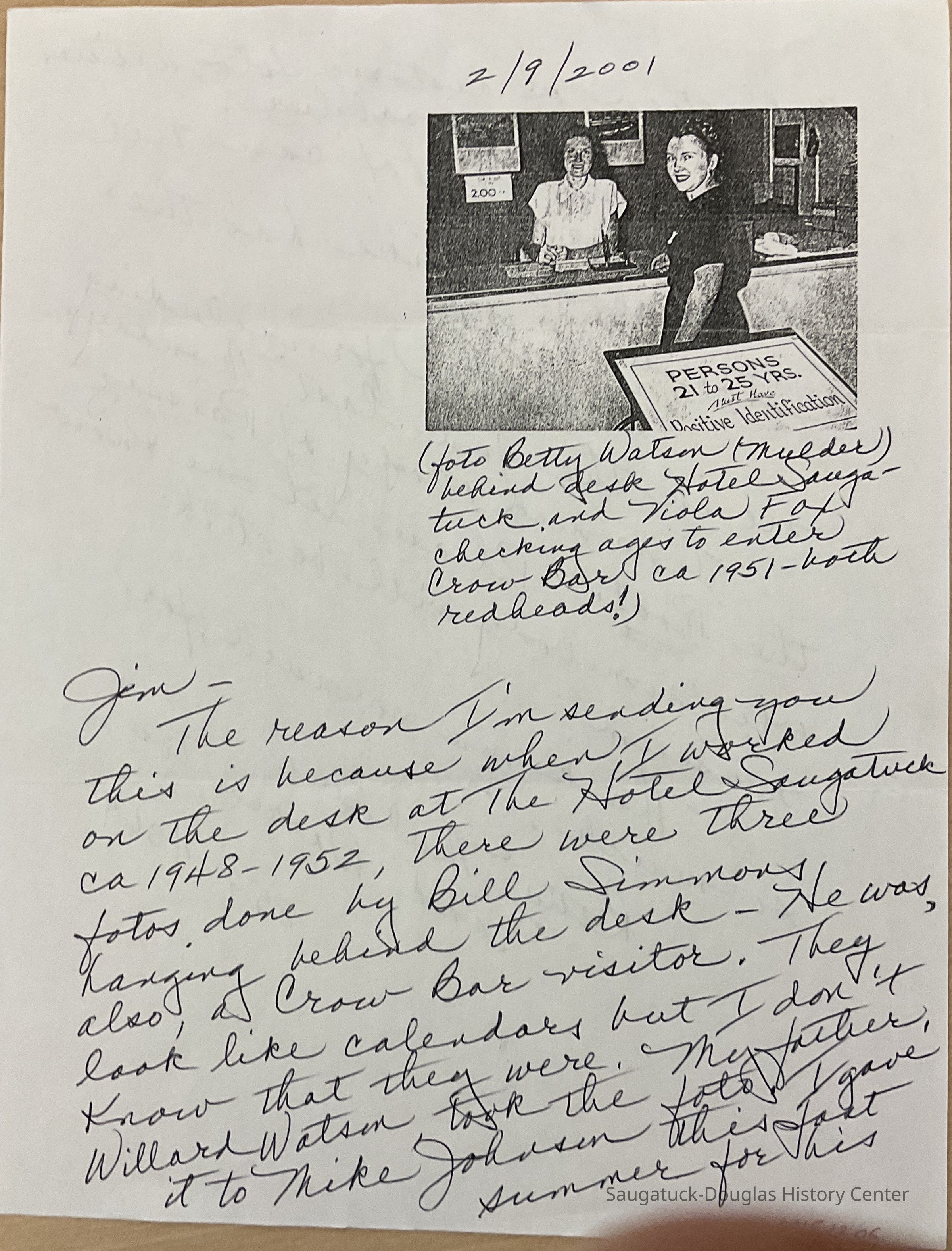 A note and photograph copy regarding Bill Simmons and the photographs of his that were hanging in the Crow Bar. ca. 1948-1952Collection
