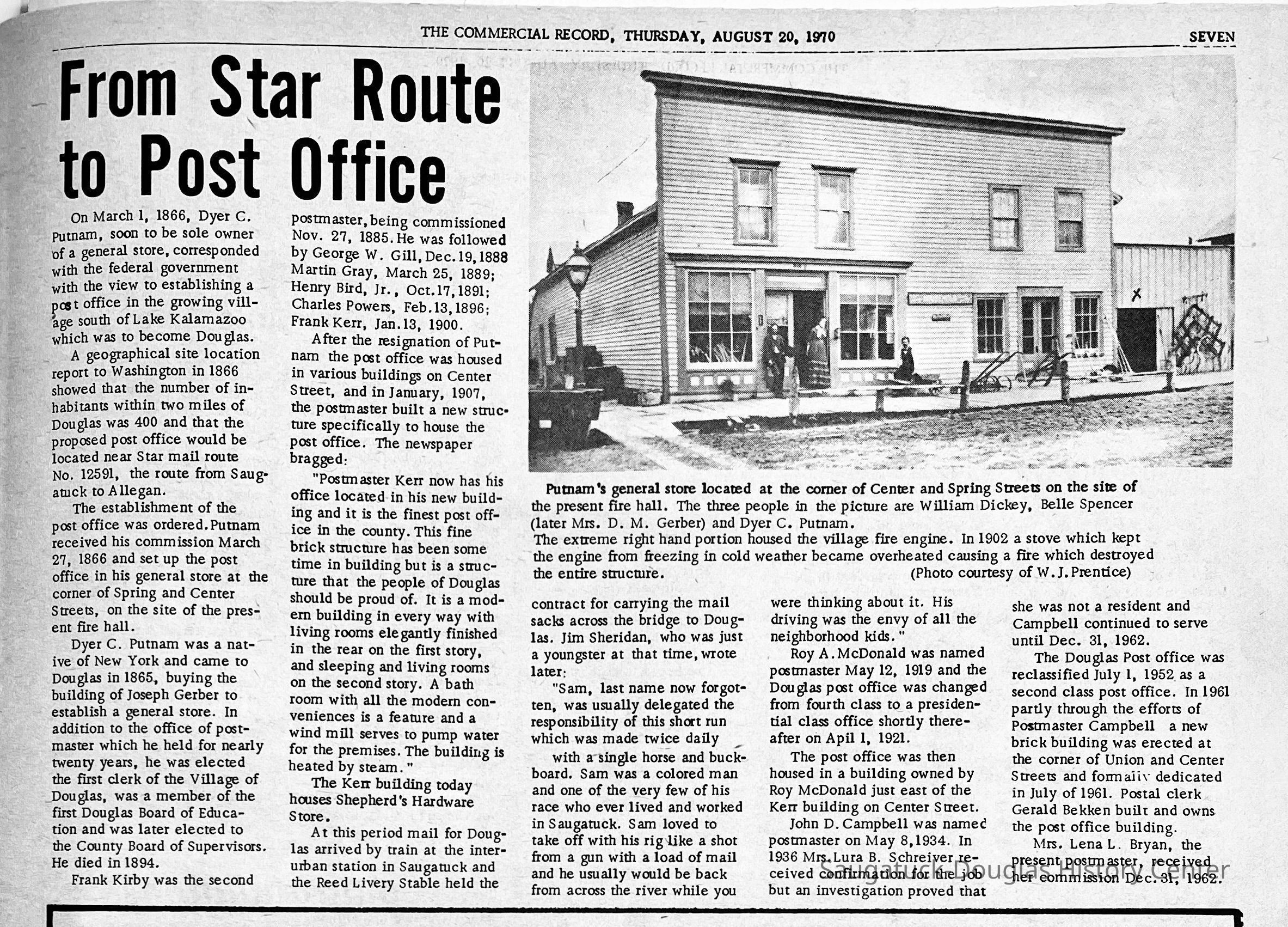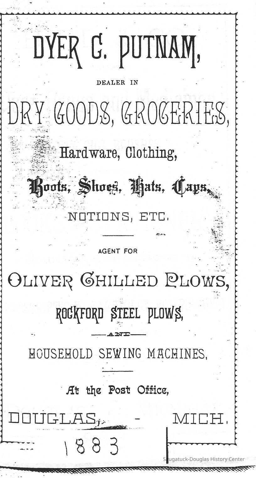 "Dyer C. Putnam, soon to open a general store, decided, after some urging by his friends, to exert some pressure on the postal authorities in Washington and proceeded to seek the establishment of a local office. After the delays usual in matters of this sort, the order was sent out and Douglas no longer had to depend on the Saugatuck office. Perhaps, not unexpectedly, Putnam was named the first postmaster and the place of office was the D. C. Putnam General Store. For many years following, twenty of which Dyer served as postmaster, the mail was sent over to the Douglas office after its arrival at Saugatuck on the stage. By 1899 the electric interurban line which ran down the shore from Holland had replaced the stage but the Douglas mail still came over from the Saugatuck office until the local interurban was abandoned in 1926. At that time both towns began to receive their mail by a truck on a star route as they do today. Putnam resigned the postmastership in 1885, and at that time the office was moved to another location on Center Street and later still to others including the Kerr building which still stands just west of Spring and Center on the south side. "Collection