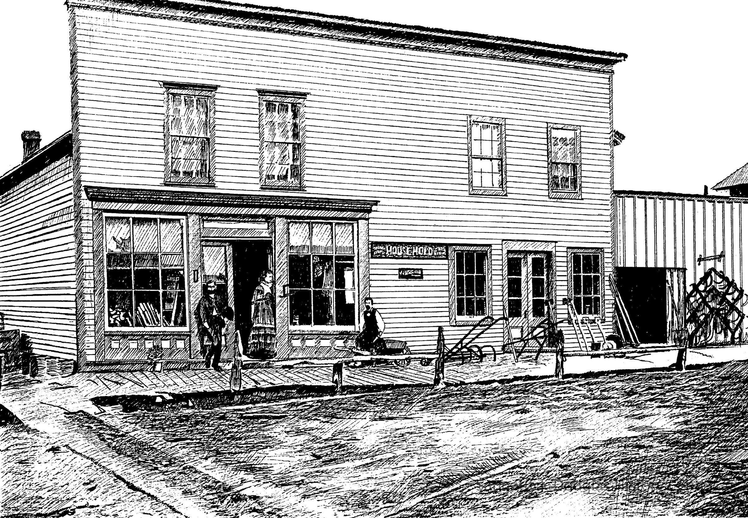 Two men and a woman pose on the wooden boardwalk in front of a two-story commercial building in Douglas. The street is unpaved. In the windows and on the boardwalk various household and farm implements are on display.