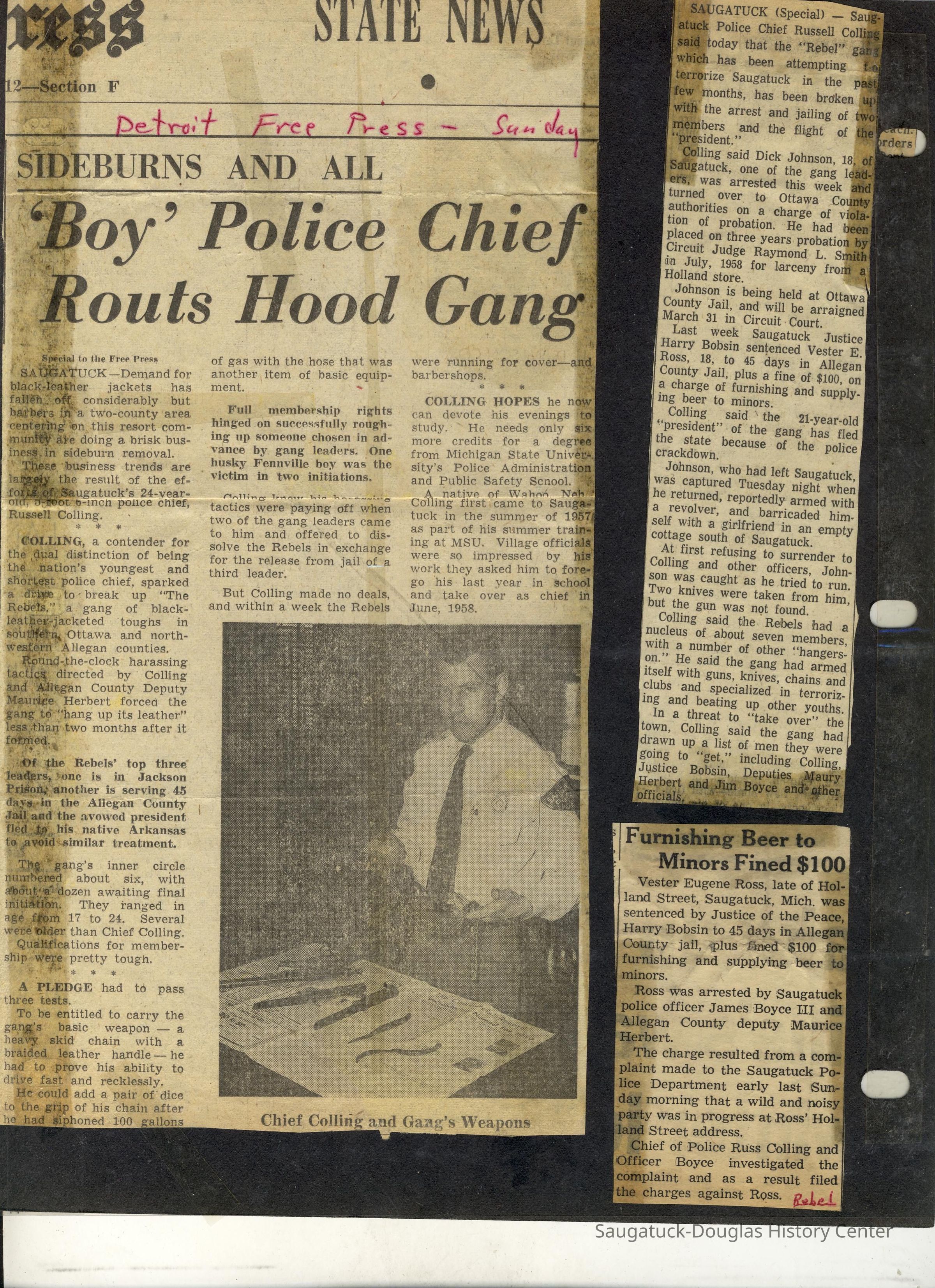 * Russell Colling was appointed Chief on April 1, 1958, two days before his 22nd birthday, after having served as a regular officer in town the year before. At 21 years of age, he remains the youngest Chief not only in Saugatuck, but in the history of the state. He was 22 when he subsequently applied for and was granted membership in the Michigan Police Chief Association.