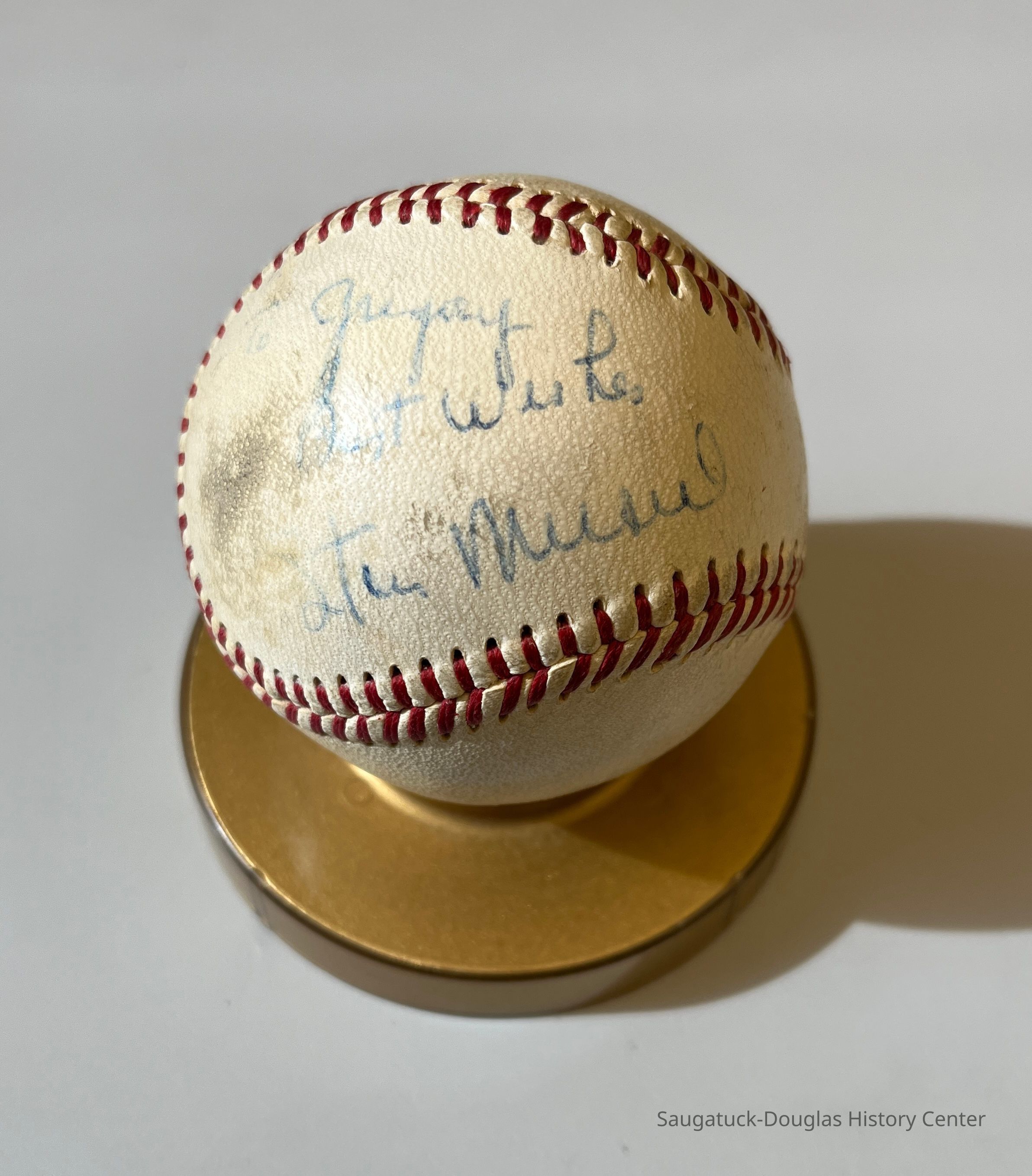 A signed baseball given to Gregory Hoffman and signed, "Best Wishes" Stan Musial. Also included is a gold colored plastic display stand with the words, "Ball of Fame."Collection
