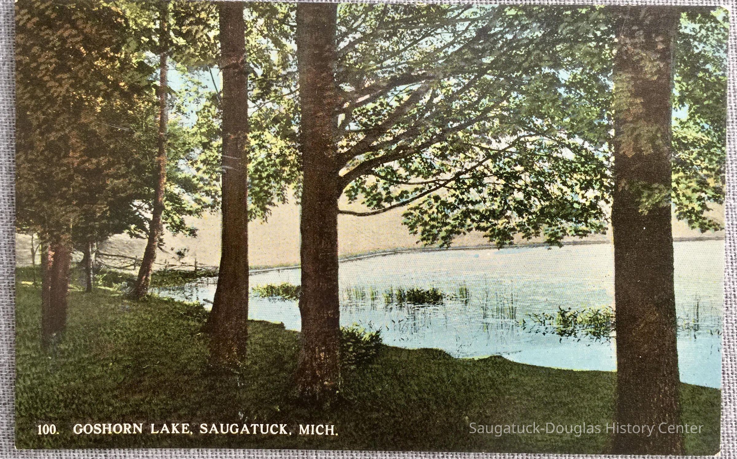 View of blue lake through darkness of mature trees. Code R-38377 at bottom center and note that card is "Made in U.S.A."