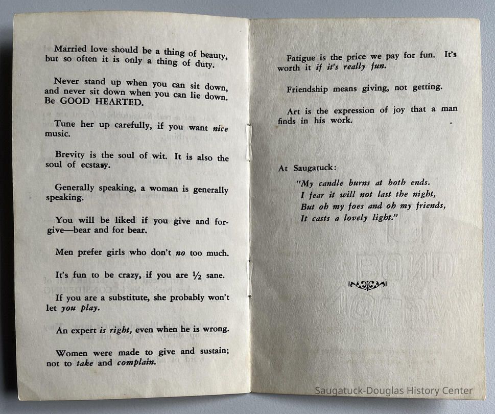 Booklet concludes with the poem "First Fig" [My candle burns at both ends;] by Edna St. Vincent Millay (1892-1950)Context