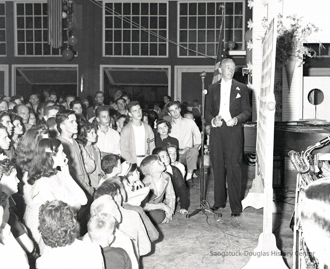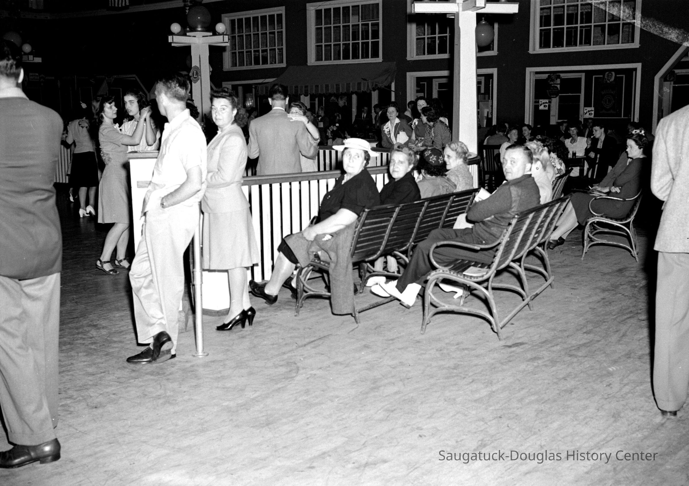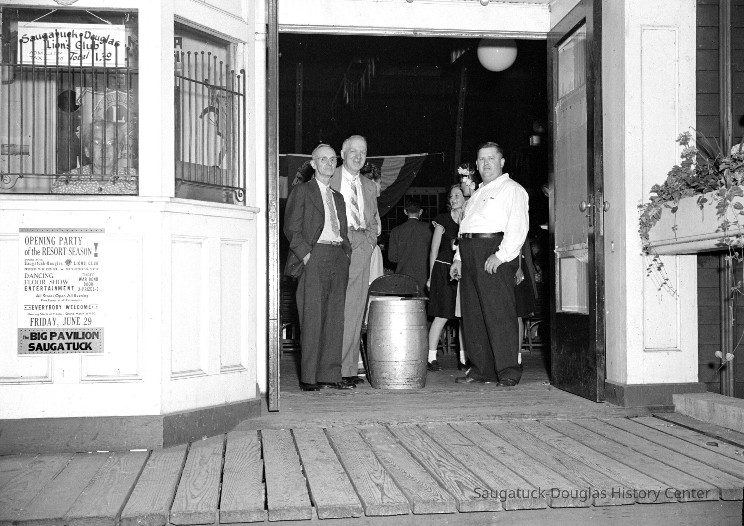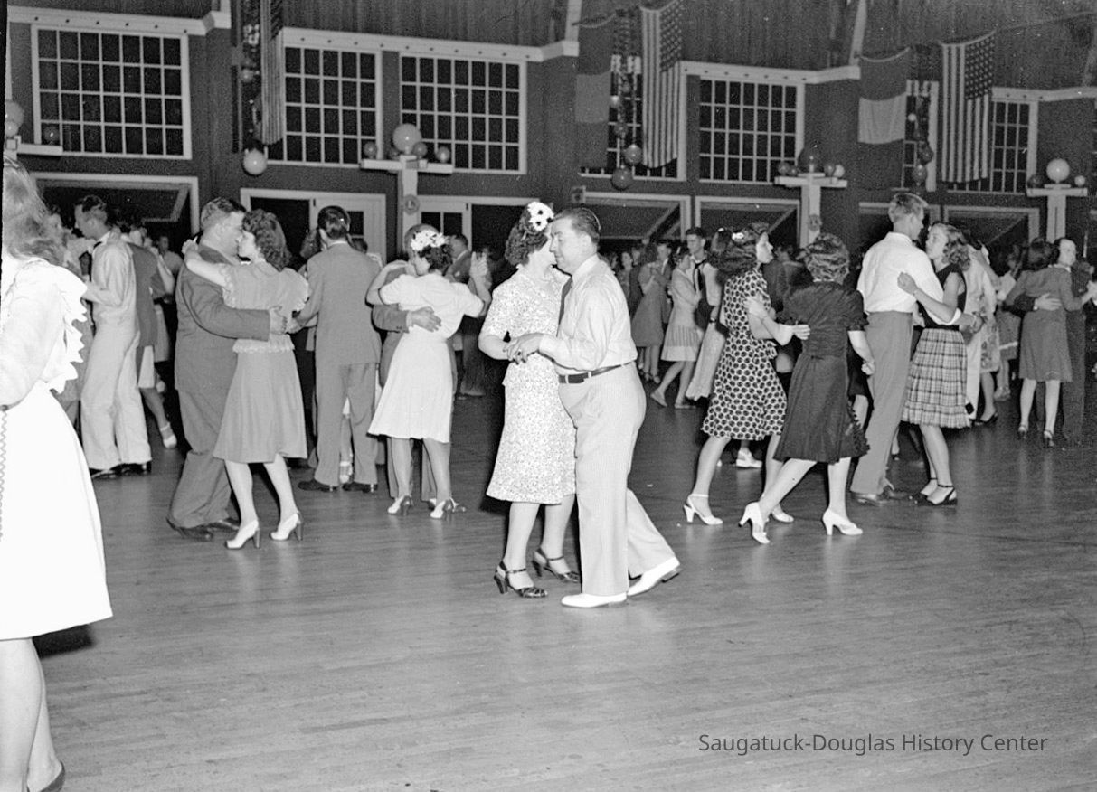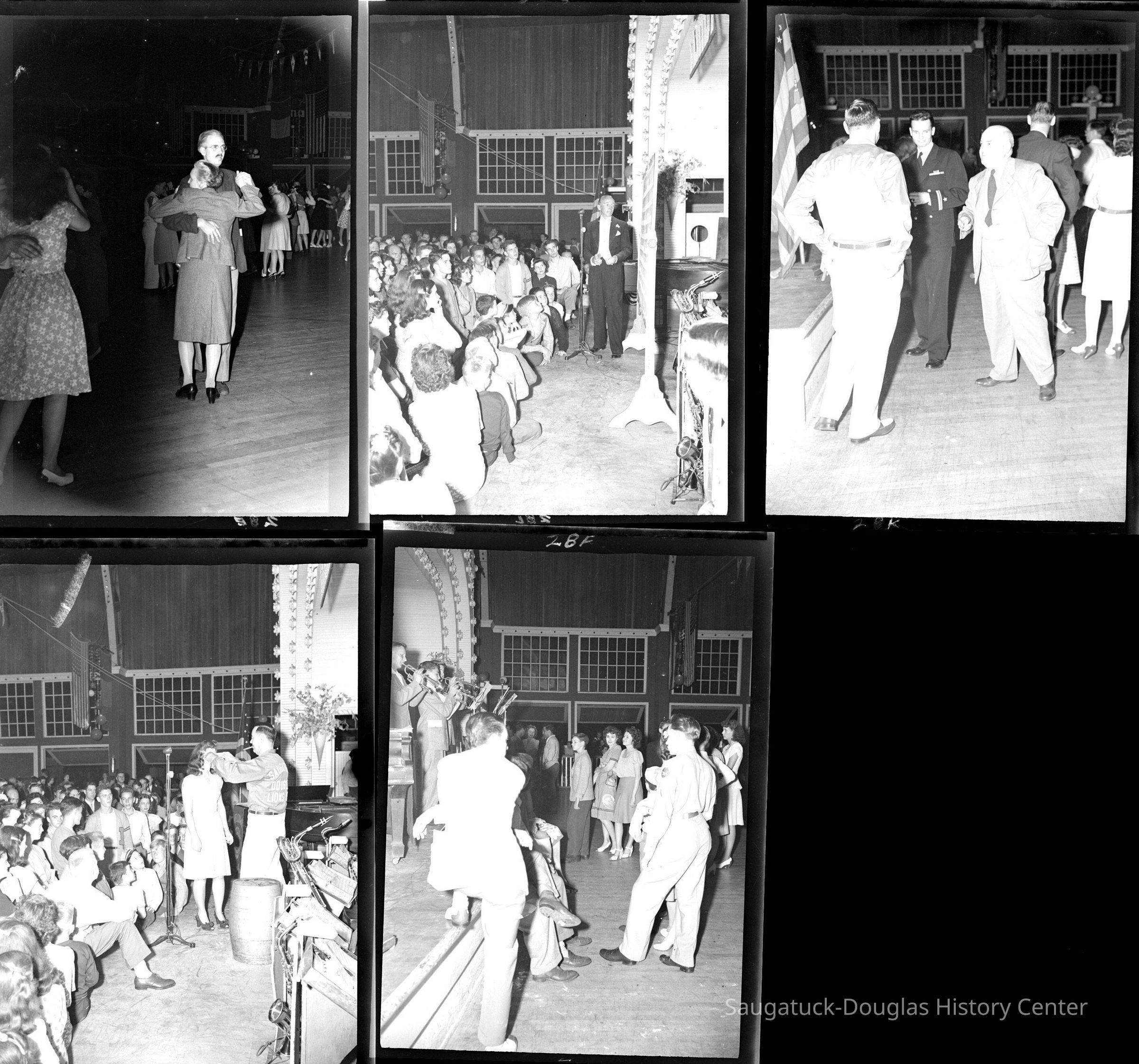 People gathered around a pinball machine, wallflowers chatting or dancers resting on the benches, crowded dance floor, trio of men standing around a barrel inside the entry door with a stoic woman in the ticket booth under a sign that reads "Saugatuck-Douglas Lions Club, admission plus tax total $1.20", a man in a tuxedo makes an announcement, a woman interacts with a man in a Lion's Club jacket on stage, the horn section of the dance orchestra blasts the crowd. Men in military uniforms sprinkled throughout the crowd.