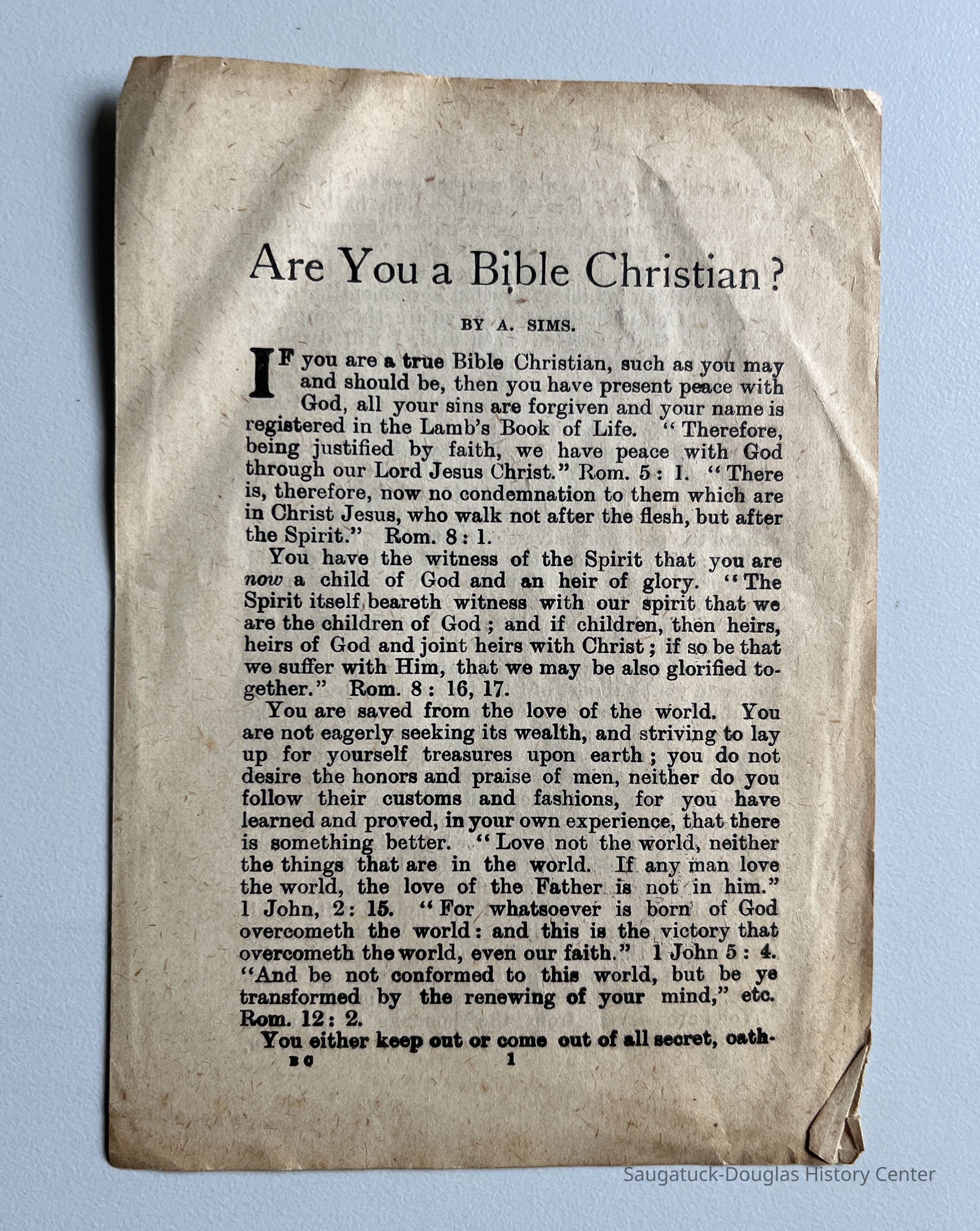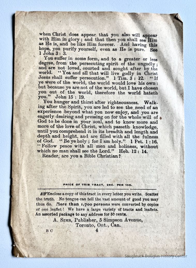 Along with the cards was a tract "Are You a Bible Christian?" by A. Sims, a four-page pamphlet published in Toronto, Canada. The tract instructs the reader to "Enclose a copy of this tract in every letter you write. Scatter the truth. No tongue can tell the vast amount of good you may thus do. More than 1,700 persons were converted by copies of one leaflet! ... An assorted package to any address for 50 cents."Context